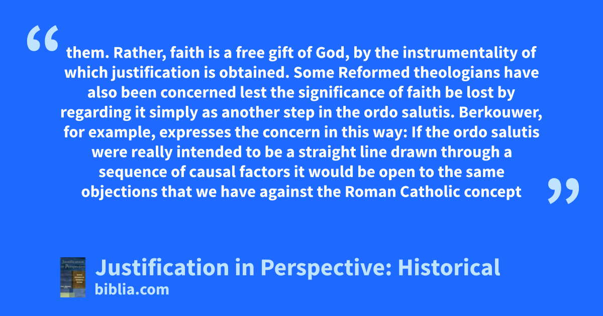 them. Rather, faith is a free gift of God, by the instrumentality of which justification is obtained. Some Reformed theologians have also been concerned lest the significance of faith be lost by regarding it simply as another step in the ordo salutis. Berkouwer, for example, expresses the concern in this way: If the ordo salutis were really intended to be a straight line drawn through a sequence of causal factors it would be open to the same objections that we have against the Roman Catholic concept