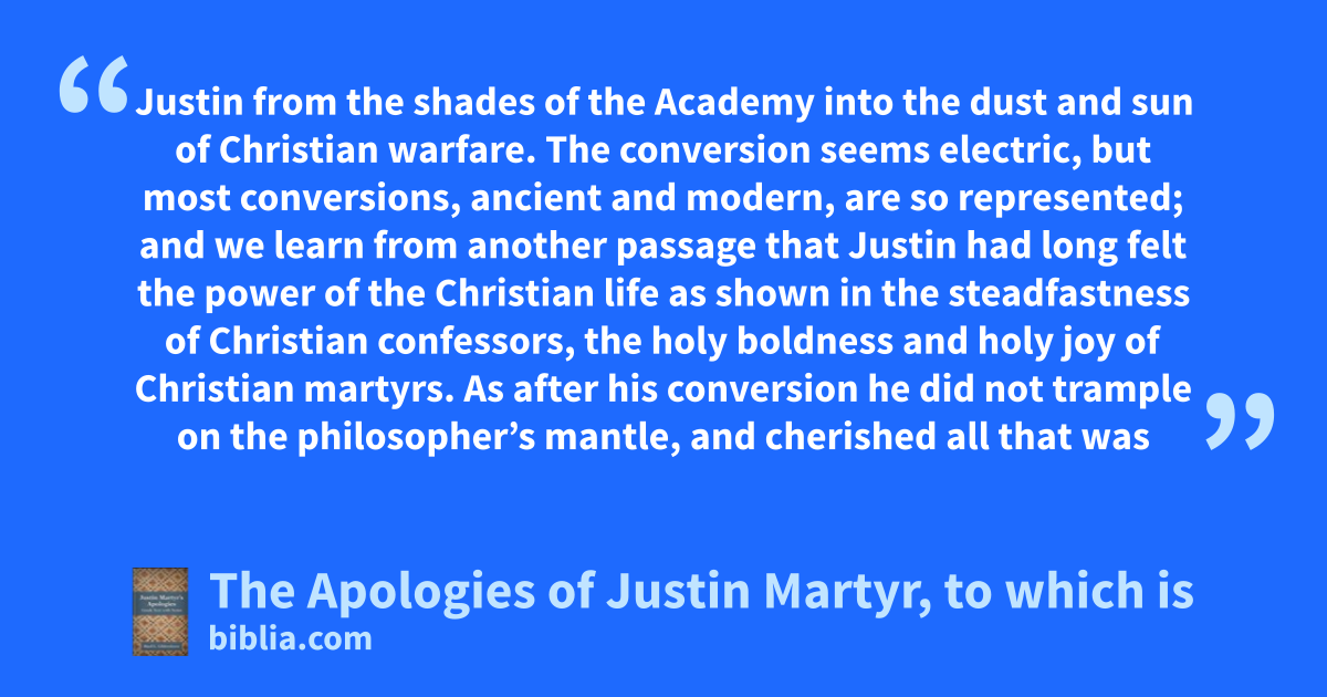 Justin from the shades of the Academy into the dust and sun of Christian warfare. The conversion seems electric, but most conversions, ancient and modern, are so represented; and we learn from another passage that Justin had long felt the power of the Christian life as shown in the steadfastness of Christian confessors, the holy boldness and holy joy of Christian martyrs. As after his conversion he did not trample on the philosopher’s mantle, and cherished all that was