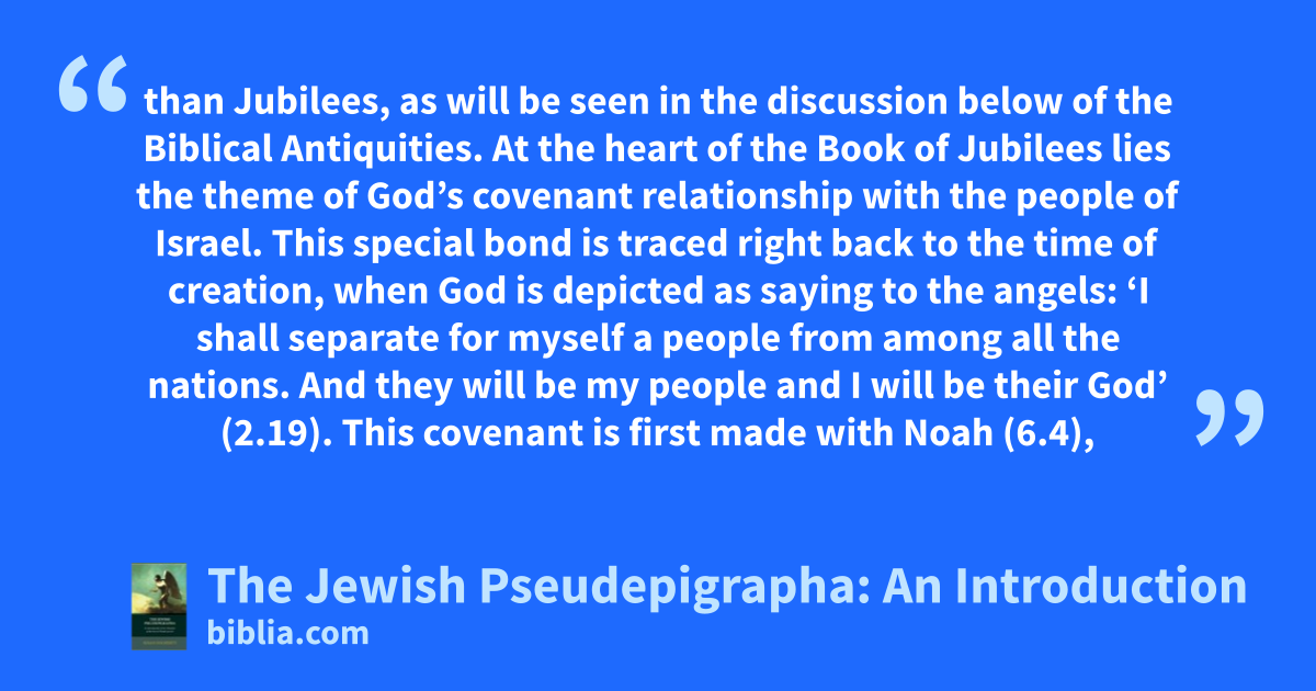 than Jubilees, as will be seen in the discussion below of the Biblical Antiquities. At the heart of the Book of Jubilees lies the theme of God’s covenant relationship with the people of Israel. This special bond is traced right back to the time of creation, when God is depicted as saying to the angels: ‘I shall separate for myself a people from among all the nations. And they will be my people and I will be their God’ (2.19). This covenant is first made with Noah (6.4),