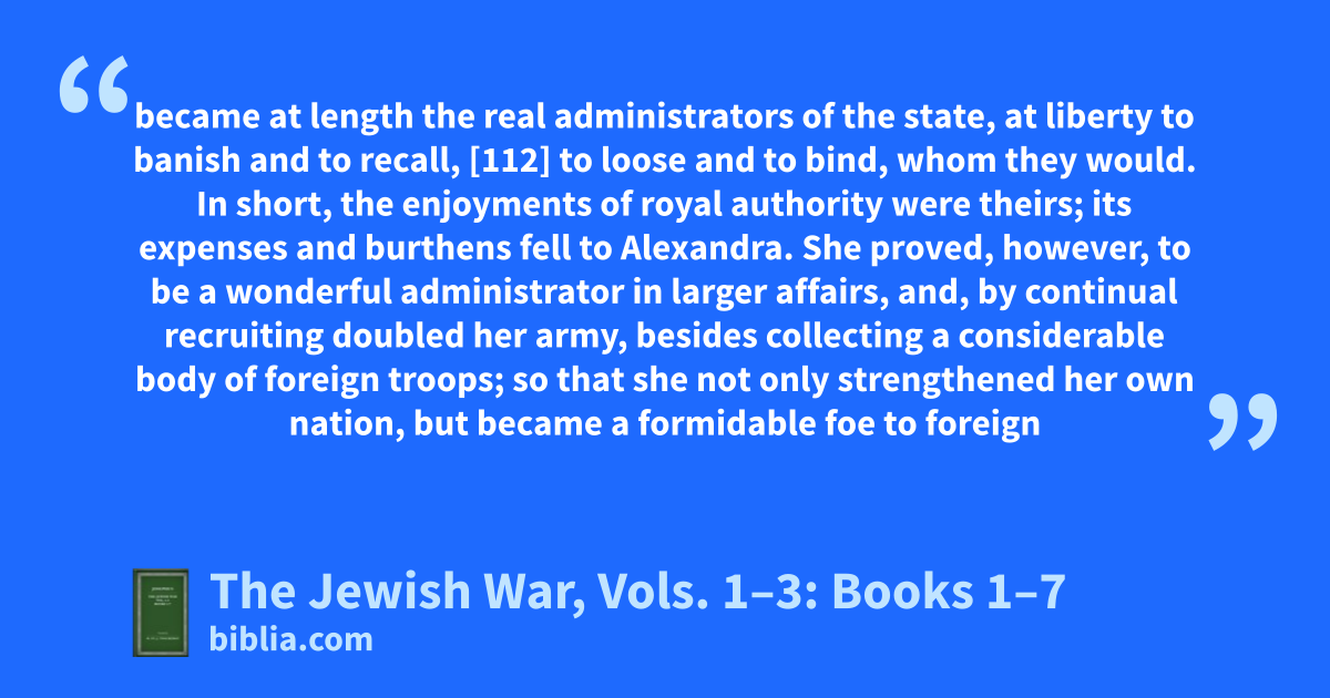 became at length the real administrators of the state, at liberty to banish and to recall, [112] to loose and to bind, whom they would. In short, the enjoyments of royal authority were theirs; its expenses and burthens fell to Alexandra. She proved, however, to be a wonderful administrator in larger affairs, and, by continual recruiting doubled her army, besides collecting a considerable body of foreign troops; so that she not only strengthened her own nation, but became a formidable foe to foreign