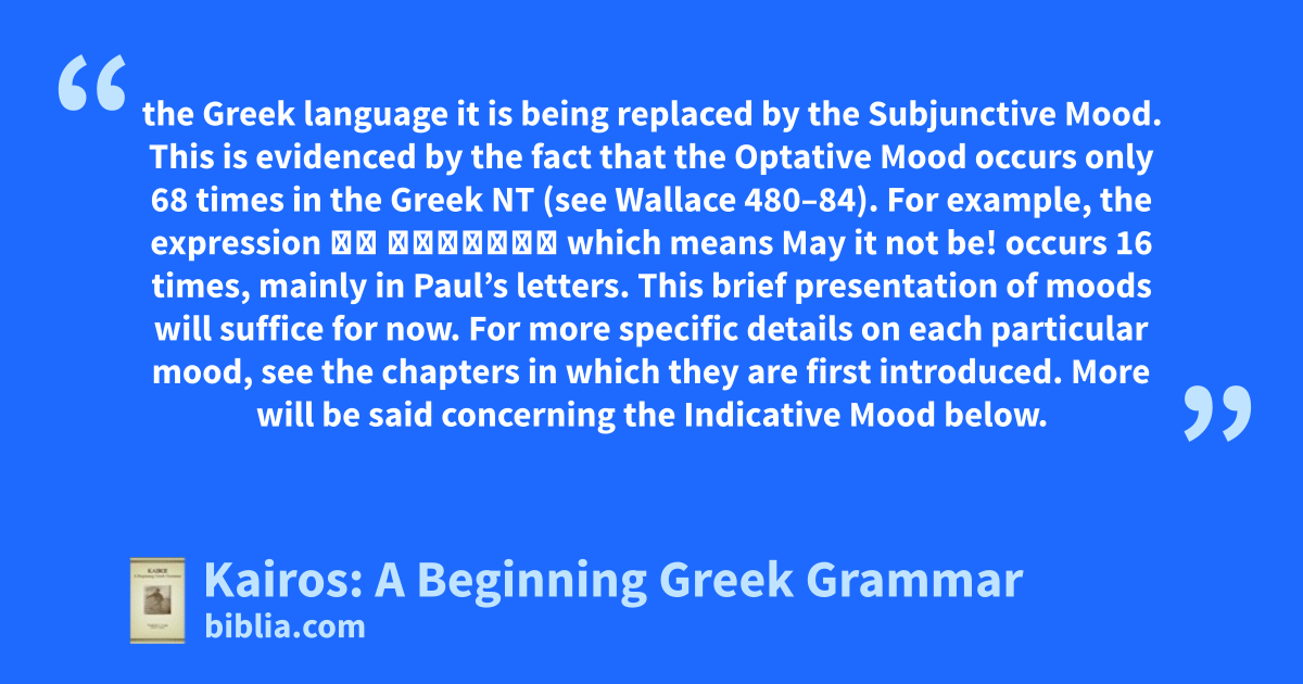 the Greek language it is being replaced by the Subjunctive Mood. This is evidenced by the fact that the Optative Mood occurs only 68 times in the Greek NT (see Wallace 480–84). For example, the expression Μὴ γένοιτο which means May it not be! occurs 16 times, mainly in Paul’s letters. This brief presentation of moods will suffice for now. For more specific details on each particular mood, see the chapters in which they are first introduced. More will be said concerning the Indicative Mood below.