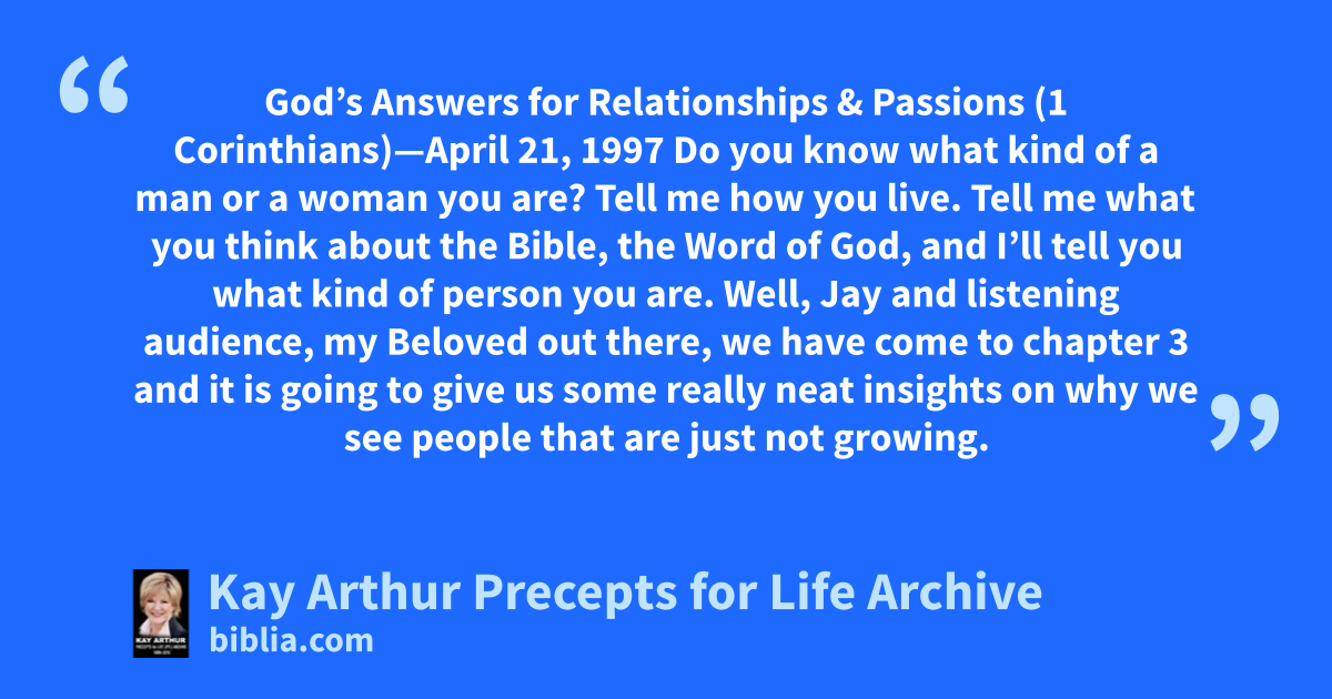 God’s Answers for Relationships & Passions (1 Corinthians)—April 21, 1997 Do you know what kind of a man or a woman you are? Tell me how you live. Tell me what you think about the Bible, the Word of God, and I’ll tell you what kind of person you are. Well, Jay and listening audience, my Beloved out there, we have come to chapter 3 and it is going to give us some really neat insights on why we see people that are just not growing.