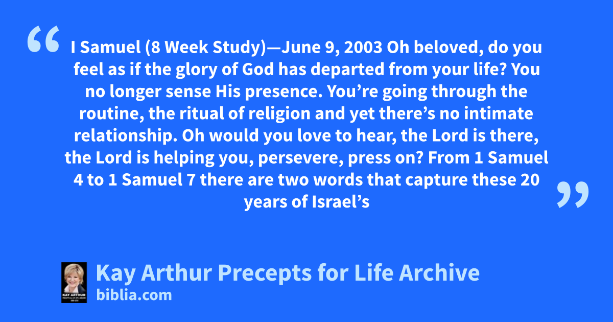 I Samuel (8 Week Study)—June 9, 2003 Oh beloved, do you feel as if the glory of God has departed from your life? You no longer sense His presence. You’re going through the routine, the ritual of religion and yet there’s no intimate relationship. Oh would you love to hear, the Lord is there, the Lord is helping you, persevere, press on? From 1 Samuel 4 to 1 Samuel 7 there are two words that capture these 20 years of Israel’s