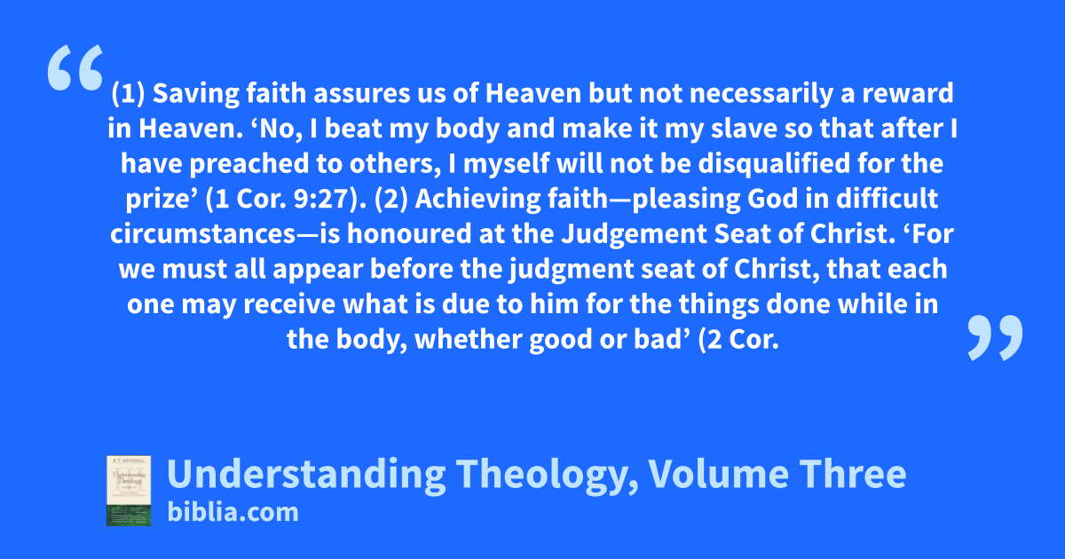 (1) Saving faith assures us of Heaven but not necessarily a reward in Heaven. ‘No, I beat my body and make it my slave so that after I have preached to others, I myself will not be disqualified for the prize’ (1 Cor. 9:27). (2) Achieving faith—pleasing God in difficult circumstances—is honoured at the Judgement Seat of Christ. ‘For we must all appear before the judgment seat of Christ, that each one may receive what is due to him for the things done while in the body, whether good or bad’ (2 Cor.