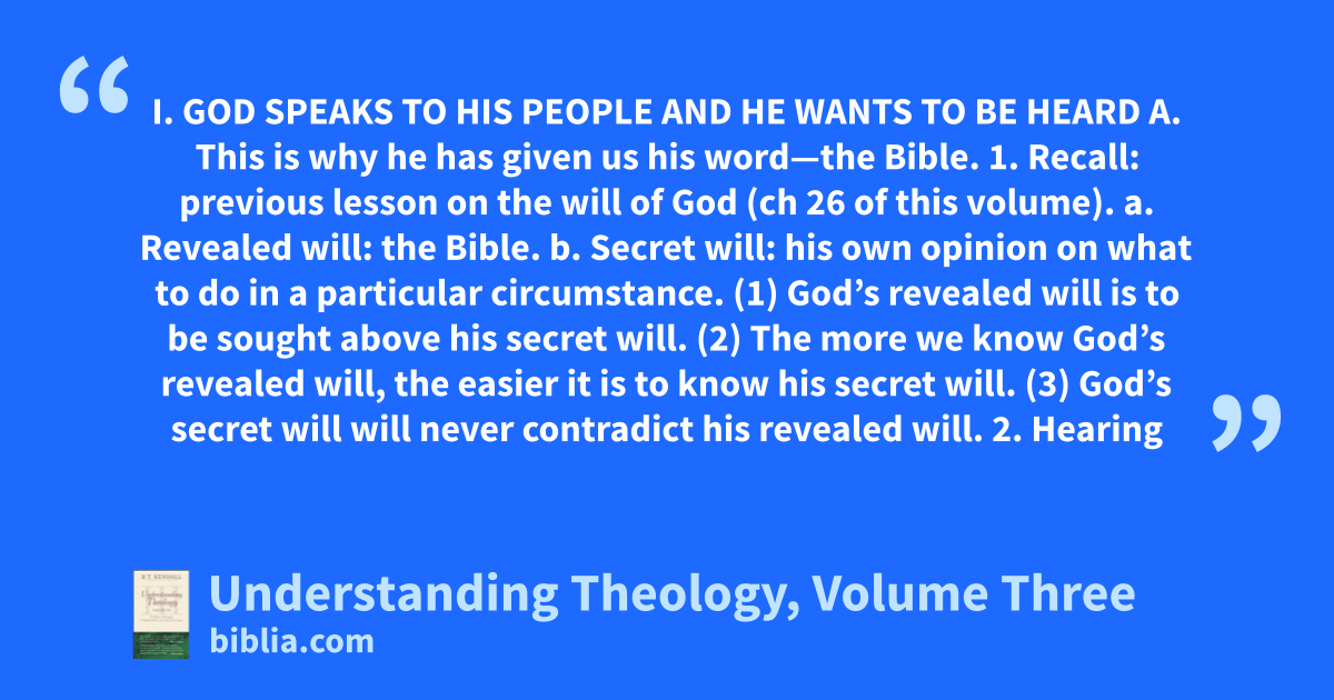 I. GOD SPEAKS TO HIS PEOPLE AND HE WANTS TO BE HEARD A. This is why he has given us his word—the Bible. 1. Recall: previous lesson on the will of God (ch 26 of this volume). a. Revealed will: the Bible. b. Secret will: his own opinion on what to do in a particular circumstance. (1) God’s revealed will is to be sought above his secret will. (2) The more we know God’s revealed will, the easier it is to know his secret will. (3) God’s secret will will never contradict his revealed will. 2. Hearing