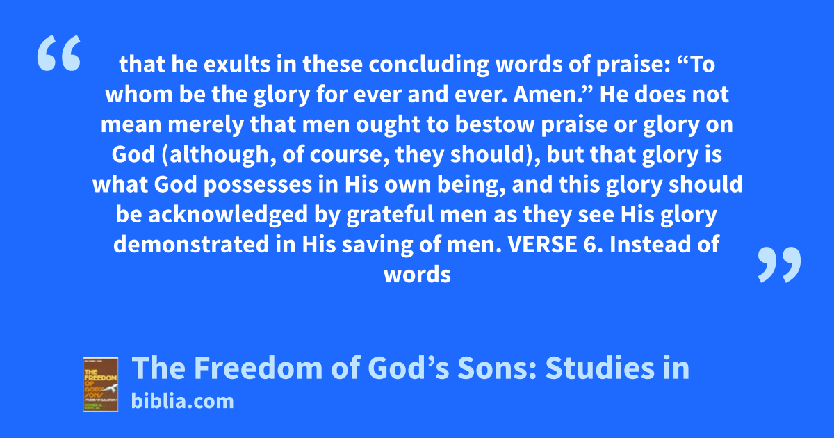 that he exults in these concluding words of praise: “To whom be the glory for ever and ever. Amen.” He does not mean merely that men ought to bestow praise or glory on God (although, of course, they should), but that glory is what God possesses in His own being, and this glory should be acknowledged by grateful men as they see His glory demonstrated in His saving of men. VERSE 6. Instead of words