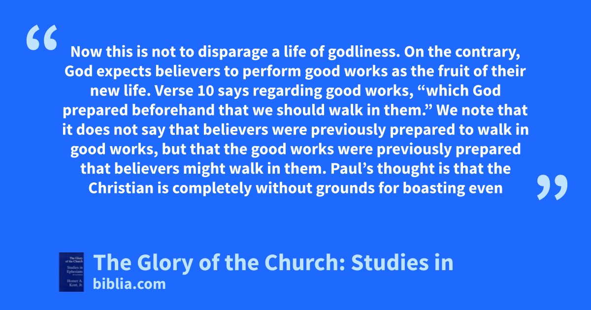 Now this is not to disparage a life of godliness. On the contrary, God expects believers to perform good works as the fruit of their new life. Verse 10 says regarding good works, “which God prepared beforehand that we should walk in them.” We note that it does not say that believers were previously prepared to walk in good works, but that the good works were previously prepared that believers might walk in them. Paul’s thought is that the Christian is completely without grounds for boasting even