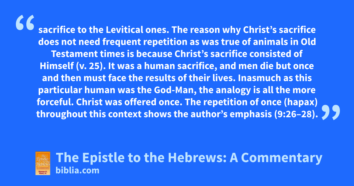 sacrifice to the Levitical ones. The reason why Christ’s sacrifice does not need frequent repetition as was true of animals in Old Testament times is because Christ’s sacrifice consisted of Himself (v. 25). It was a human sacrifice, and men die but once and then must face the results of their lives. Inasmuch as this particular human was the God-Man, the analogy is all the more forceful. Christ was offered once. The repetition of once (hapax) throughout this context shows the author’s emphasis (9:26–28).