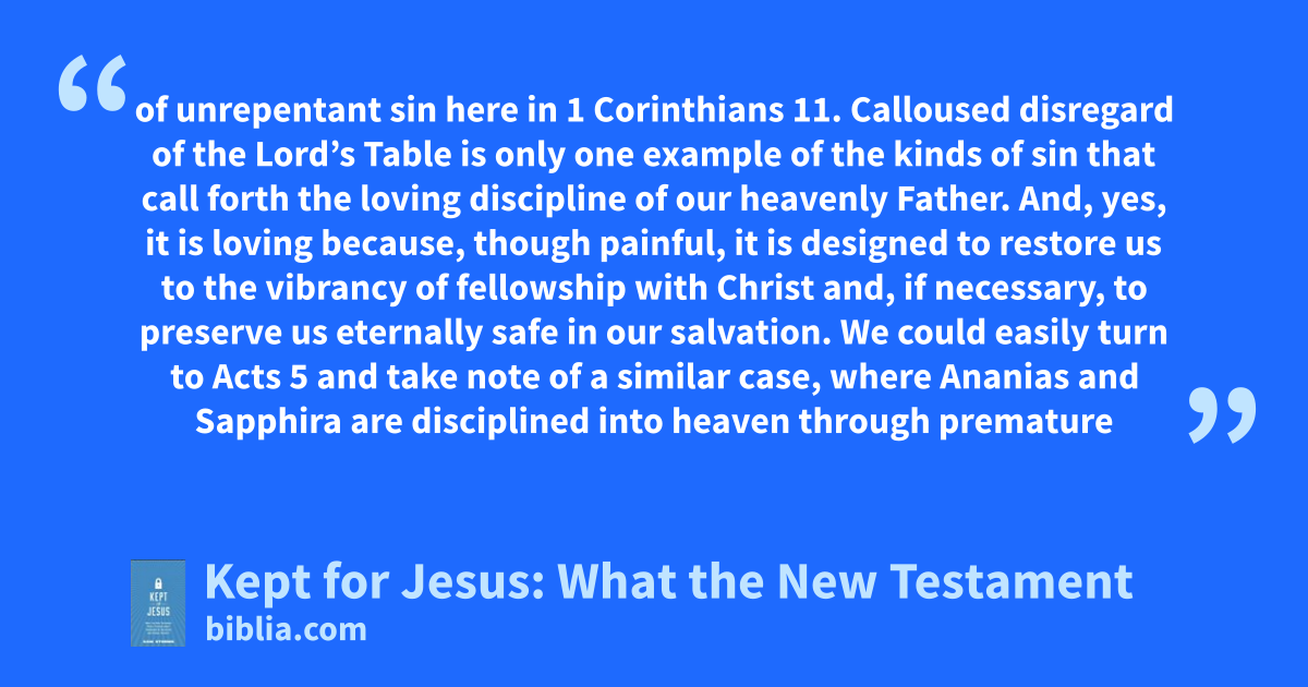 of unrepentant sin here in 1 Corinthians 11. Calloused disregard of the Lord’s Table is only one example of the kinds of sin that call forth the loving discipline of our heavenly Father. And, yes, it is loving because, though painful, it is designed to restore us to the vibrancy of fellowship with Christ and, if necessary, to preserve us eternally safe in our salvation. We could easily turn to Acts 5 and take note of a similar case, where Ananias and Sapphira are disciplined into heaven through premature