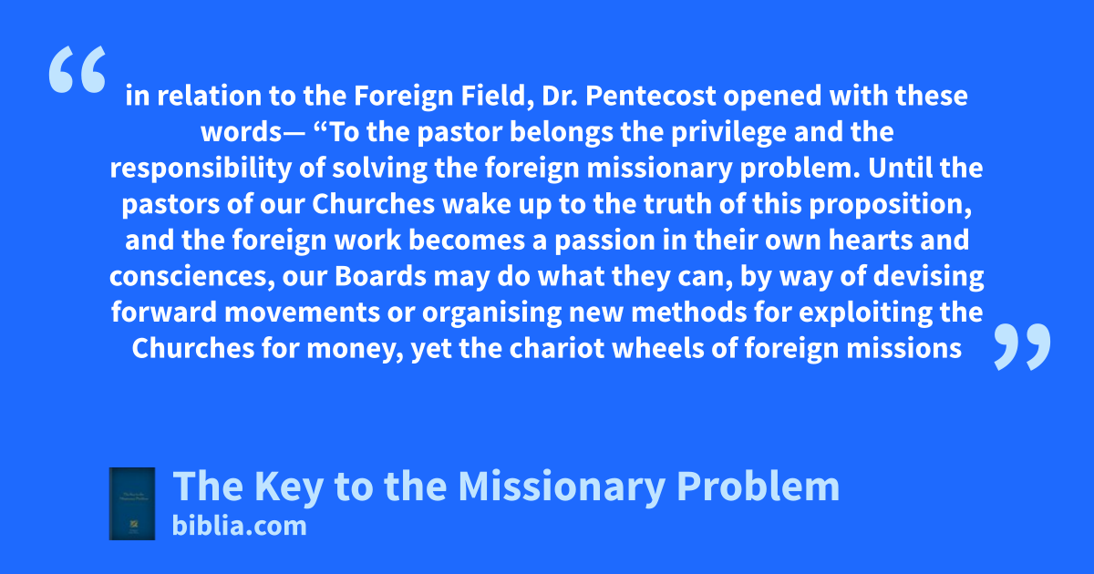 in relation to the Foreign Field, Dr. Pentecost opened with these words— “To the pastor belongs the privilege and the responsibility of solving the foreign missionary problem. Until the pastors of our Churches wake up to the truth of this proposition, and the foreign work becomes a passion in their own hearts and consciences, our Boards may do what they can, by way of devising forward movements or organising new methods for exploiting the Churches for money, yet the chariot wheels of foreign missions