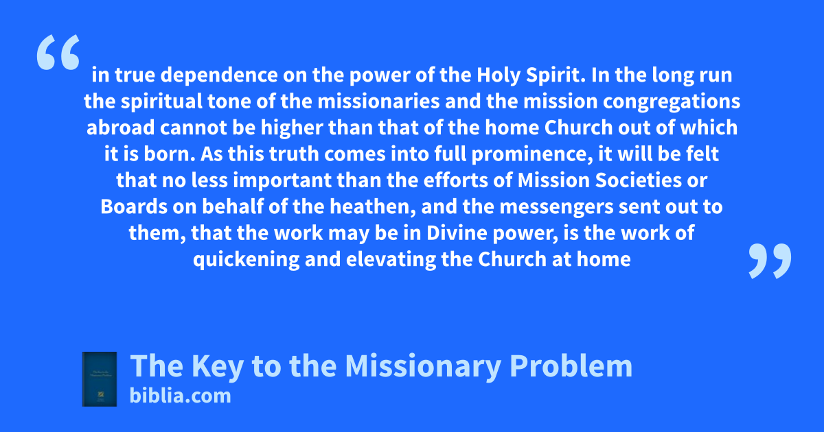 in true dependence on the power of the Holy Spirit. In the long run the spiritual tone of the missionaries and the mission congregations abroad cannot be higher than that of the home Church out of which it is born. As this truth comes into full prominence, it will be felt that no less important than the efforts of Mission Societies or Boards on behalf of the heathen, and the messengers sent out to them, that the work may be in Divine power, is the work of quickening and elevating the Church at home