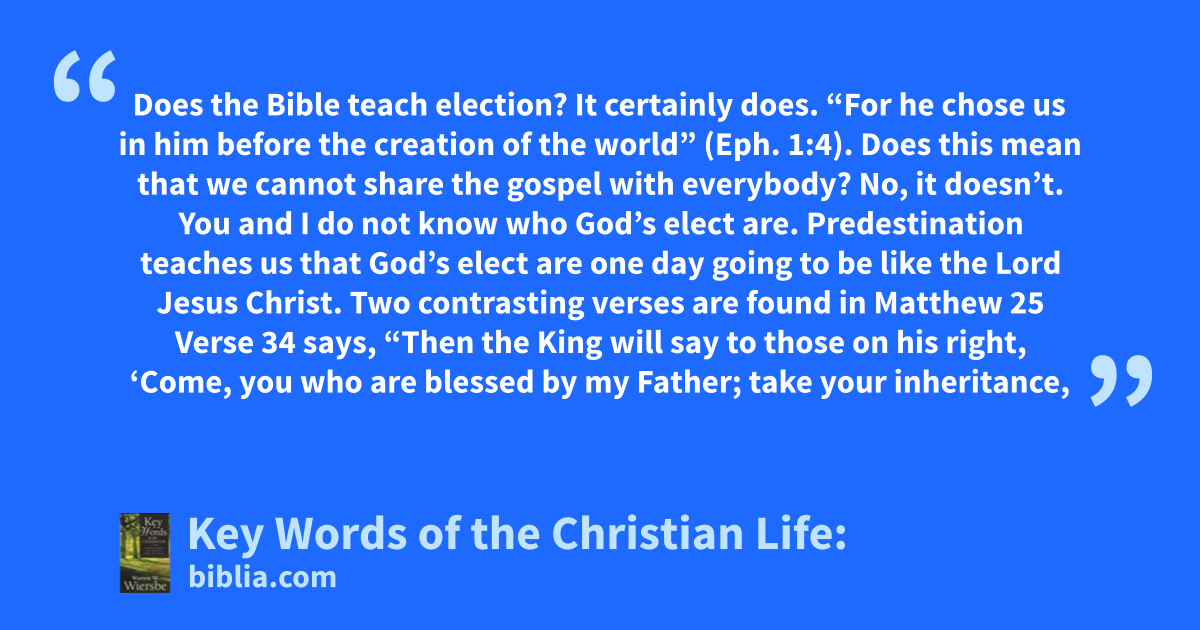 Does the Bible teach election? It certainly does. “For he chose us in him before the creation of the world” (Eph. 1:4). Does this mean that we cannot share the gospel with everybody? No, it doesn’t. You and I do not know who God’s elect are. Predestination teaches us that God’s elect are one day going to be like the Lord Jesus Christ. Two contrasting verses are found in Matthew 25 Verse 34 says, “Then the King will say to those on his right, ‘Come, you who are blessed by my Father; take your inheritance,