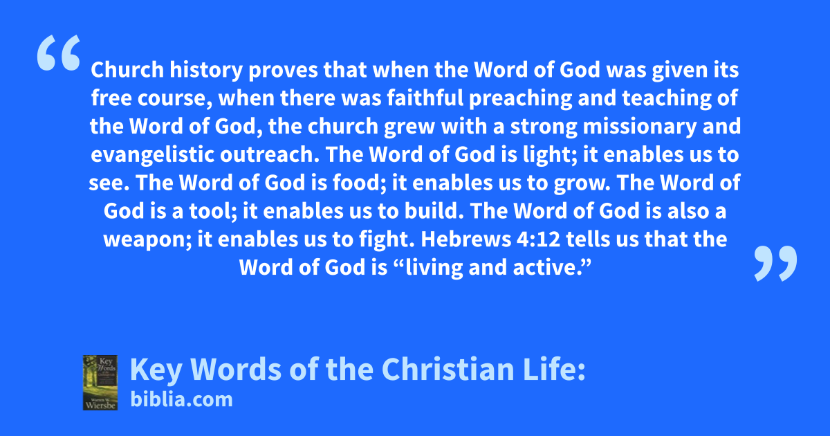 Church history proves that when the Word of God was given its free course, when there was faithful preaching and teaching of the Word of God, the church grew with a strong missionary and evangelistic outreach. The Word of God is light; it enables us to see. The Word of God is food; it enables us to grow. The Word of God is a tool; it enables us to build. The Word of God is also a weapon; it enables us to fight. Hebrews 4:12 tells us that the Word of God is “living and active.”