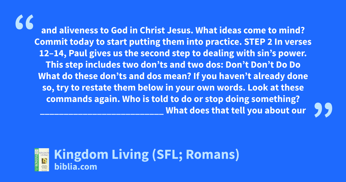and aliveness to God in Christ Jesus. What ideas come to mind? Commit today to start putting them into practice. STEP 2 In verses 12–14, Paul gives us the second step to dealing with sin’s power. This step includes two don’ts and two dos: Don’t Don’t Do Do What do these don’ts and dos mean? If you haven’t already done so, try to restate them below in your own words. Look at these commands again. Who is told to do or stop doing something? __________________________ What does that tell you about our