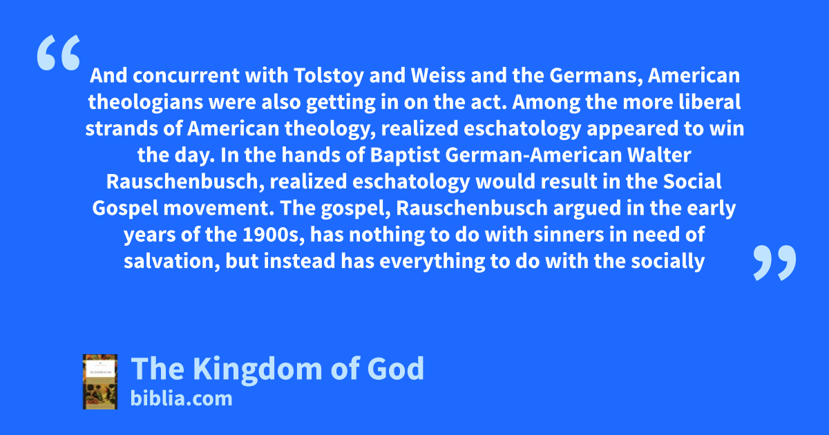 And concurrent with Tolstoy and Weiss and the Germans, American theologians were also getting in on the act. Among the more liberal strands of American theology, realized eschatology appeared to win the day. In the hands of Baptist German-American Walter Rauschenbusch, realized eschatology would result in the Social Gospel movement. The gospel, Rauschenbusch argued in the early years of the 1900s, has nothing to do with sinners in need of salvation, but instead has everything to do with the socially