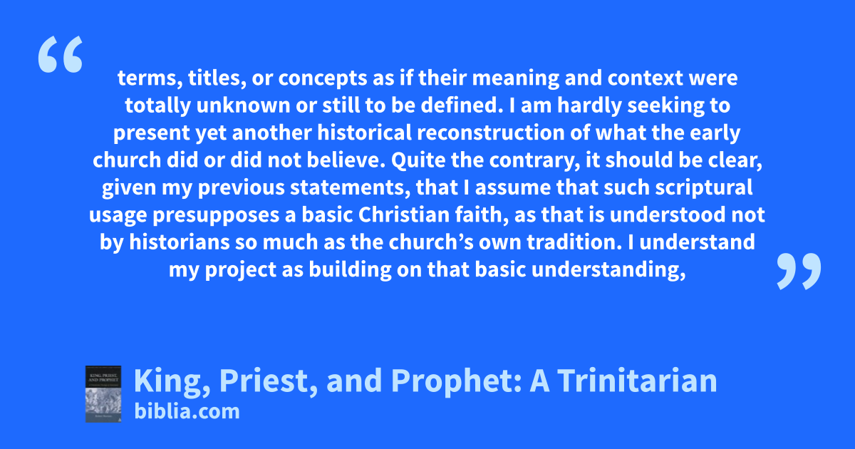 terms, titles, or concepts as if their meaning and context were totally unknown or still to be defined. I am hardly seeking to present yet another historical reconstruction of what the early church did or did not believe. Quite the contrary, it should be clear, given my previous statements, that I assume that such scriptural usage presupposes a basic Christian faith, as that is understood not by historians so much as the church’s own tradition. I understand my project as building on that basic understanding,