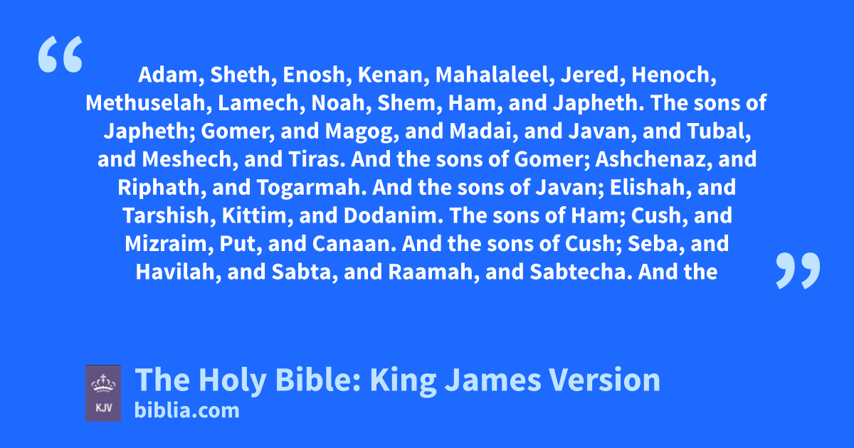 1 Adam, Sheth, Enosh, 2 Kenan, Mahalaleel, Jered, 3 Henoch, Methuselah, Lamech, 4 Noah, Shem, Ham, and Japheth. 5 The sons of Japheth; Gomer, and Magog, and Madai, and Javan, and Tubal, and Meshech, and Tiras. 6 And the sons of Gomer; Ashchenaz, and Riphatha, and Togarmah. 7 And the sons of Javan; Elishah, and Tarshish, Kittim, and Dodanimb. 8 The sons of Ham; Cush, and Mizraim, Put, and Canaan. 9 And the sons of Cush; Seba, and Havilah, and Sabta, and Raamah, and Sabtecha. And the sons of Raamah; Sheba, and Dedan. 10 And Cush begat Nimrod: he began to be mighty upon the earth. 11 And Mizraim begat Ludim, and Anamim, and Lehabim, and Naphtuhim, 12 And Pathrusim, and Casluhim, (of whom came the Philistines,) and Caphthorim. 13 And Canaan begat Zidon his firstborn, and Heth, 14 The Jebusite also, and the Amorite, and the Girgashite, 15 And the Hivite, and the Arkite, and the Sinite, 16 And the Arvadite, and the Zemarite, and the Hamathite. 17 The sons of Shem; Elam, and Asshur, and Arphaxad, and Lud, and Aram, and Uz, and Hul, and Gether, and Meshechc. 18 And Arphaxad begat Shelah, and Shelah begat Eber. 19 And unto Eber were born two sons: the name of the one was Pelegd; because in his days the earth was divided: and his brother’s name was Joktan. 20 And Joktan begat Almodad, and Sheleph, and Hazarmaveth, and Jerah, 21 Hadoram also, and Uzal, and Diklah, 22 And Ebal, and Abimael, and Sheba, 23 And Ophir, and Havilah, and Jobab. All these were the sons of Joktan. 24 Shem, Arphaxad, Shelah, 25 Eber, Peleg, Reu, 26 Serug, Nahor, Terah, 27 Abram; the same is Abraham.