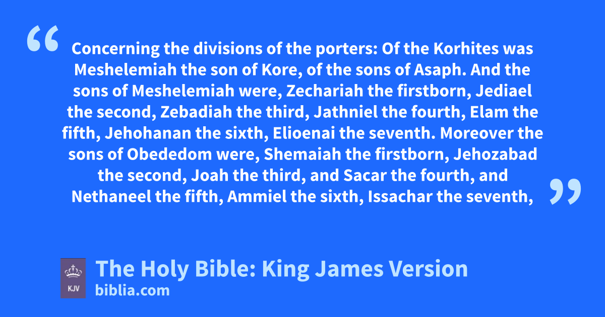 1 Concerning the divisions of the porters: Of the Korhites was Meshelemiaha the son of Kore, of the sons of Asaph. 2 And the sons of Meshelemiah were, Zechariah the firstborn, Jediael the second, Zebadiah the third, Jathniel the fourth, 3 Elam the fifth, Jehohanan the sixth, Elioenai the seventh. 4 Moreover the sons of Obededom were, Shemaiah the firstborn, Jehozabad the second, Joah the third, and Sacar the fourth, and Nethaneel the fifth, 5 Ammiel the sixth, Issachar the seventh, Peulthai the eighth: for God blessed him. b 6 Also unto Shemaiah his son were sons born, that ruled throughout the house of their father: for they were mighty men of valour. 7 The sons of Shemaiah; Othni, and Rephael, and Obed, Elzabad, whose brethren were strong men, Elihu, and Semachiah. 8 All these of the sons of Obededom: they and their sons and their brethren, able men for strength for the service, were threescore and two of Obededom. 9 And Meshelemiah had sons and brethren, strong men, eighteen. 10 Also Hosah, of the children of Merari, had sons; Simri the chief, (for though he was not the firstborn, yet his father made him the chief;) 11 Hilkiah the second, Tebaliah the third, Zechariah the fourth: all the sons and brethren of Hosah were thirteen. 12 Among these were the divisions of the porters, even among the chief men, having wards one against another, to minister in the house of the LORD. 13 And they cast lots, as well the small as the great, according to the house of their fathers, for every gate. 14 And the lot eastward fell to Shelemiahc. Then for Zechariah his son, a wise counsellor, they cast lots; and his lot came out northward. 15 To Obededom southward; and to his sons the house of Asuppimd. 16 To Shuppim and Hosah the lot came forth westward, with the gate Shallecheth, by the causeway of the going up, ward against ward. 17 Eastward were six Levites, northward four a day, southward four a day, and toward Asuppim two and two. 18 At Parbar westward, four at the causeway, and two at Parbar. 19 These are the divisions of the porters among the sons of Kore, and among the sons of Merari.