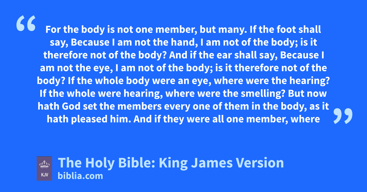 12 For as the body is one, and hath many members, and all the members of that one body, being many, are one body: so also is Christ. 13 For by one Spirit are we all baptized into one body, whether we be Jews or Gentilesc, whether we be bond or free; and have been all made to drink into one Spirit. 14 For the body is not one member, but many. 15 If the foot shall say, Because I am not the hand, I am not of the body; is it therefore not of the body? 16 And if the ear shall say, Because I am not the eye, I am not of the body; is it therefore not of the body? 17 If the whole body were an eye, where were the hearing? If the whole were hearing, where were the smelling? 18 But now hath God set the members every one of them in the body, as it hath pleased him. 19 And if they were all one member, where were the body? 20 But now are they many members, yet but one body. 21 And the eye cannot say unto the hand, I have no need of thee: nor again the head to the feet, I have no need of you. 22 Nay, much more those members of the body, which seem to be more feeble, are necessary: 23 And those members of the body, which we think to be less honourable, upon these we bestowd more abundant honour; and our uncomely parts have more abundant comeliness. 24 For our comely parts have no need: but God hath tempered the body together, having given more abundant honour to that part which lacked: 25 That there should be no schisme in the body; but that the members should have the same care one for another. 26 And whether one member suffer, all the members suffer with it; or one member be honoured, all the members rejoice with it.