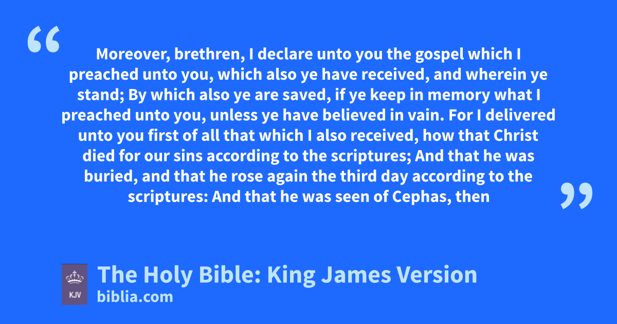 1 Moreover, brethren, I declare unto you the gospel which I preached unto you, which also ye have received, and wherein ye stand; 2 By which also ye are saved, if ye keepa in memory what I preached unto you, unless ye have believed in vain. 3 For I delivered unto you first of all that which I also received, how that Christ died for our sins according to the scriptures; 4 And that he was buried, and that he rose again the third day according to the scriptures: 5 And that he was seen of Cephas, then of the twelve: 6 After that, he was seen of above five hundred brethren at once; of whom the greater part remain unto this present, but some are fallen asleep. 7 After that, he was seen of James; then of all the apostles. 8 And last of all he was seen of me also, as of one born out of due time. 9 For I am the least of the apostles, that am not meet to be called an apostle, because I persecuted the church of God. 10 But by the grace of God I am what I am: and his grace which was bestowed upon me was not in vain; but I laboured more abundantly than they all: yet not I, but the grace of God which was with me. 11 Therefore whether it were I or they, so we preach, and so ye believed.