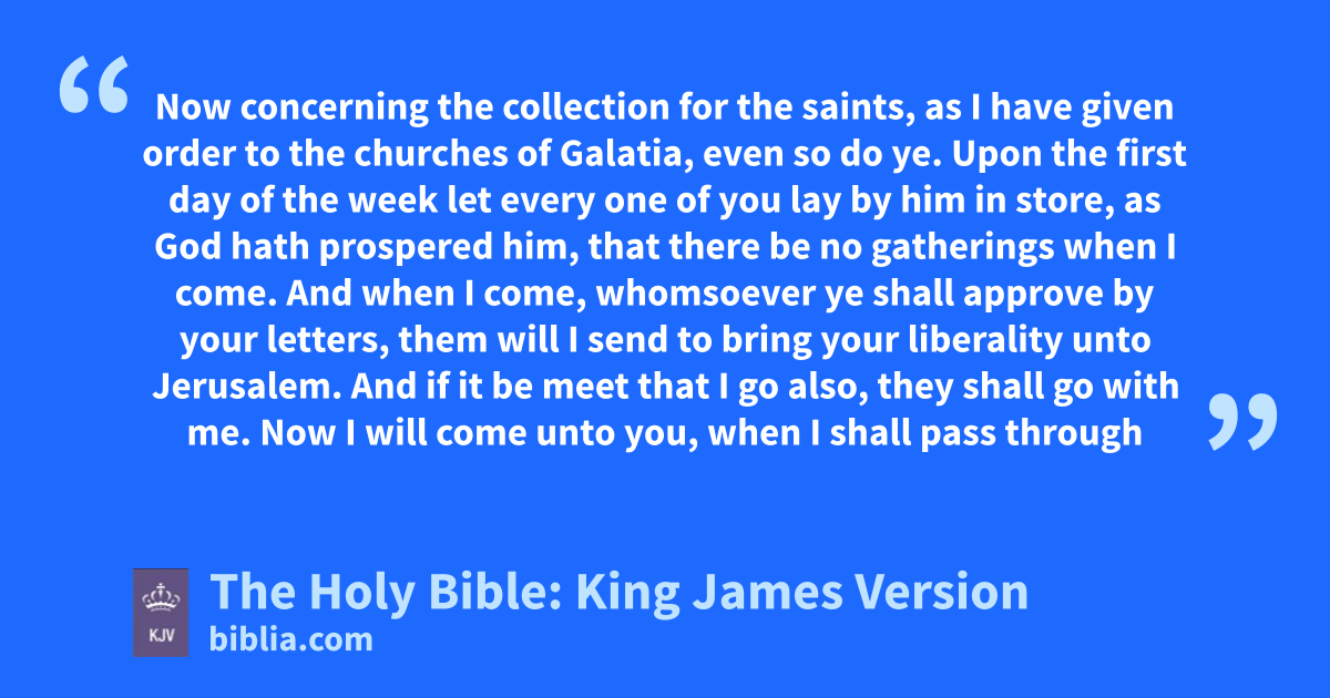 1 Now concerning the collection for the saints, as I have given order to the churches of Galatia, even so do ye. 2 Upon the first day of the week let every one of you lay by him in store, as God hath prospered him, that there be no gatherings when I come. 3 And when I come, whomsoever ye shall approve by your letters, them will I send to bring your liberalitya unto Jerusalem. 4 And if it be meet that I go also, they shall go with me.