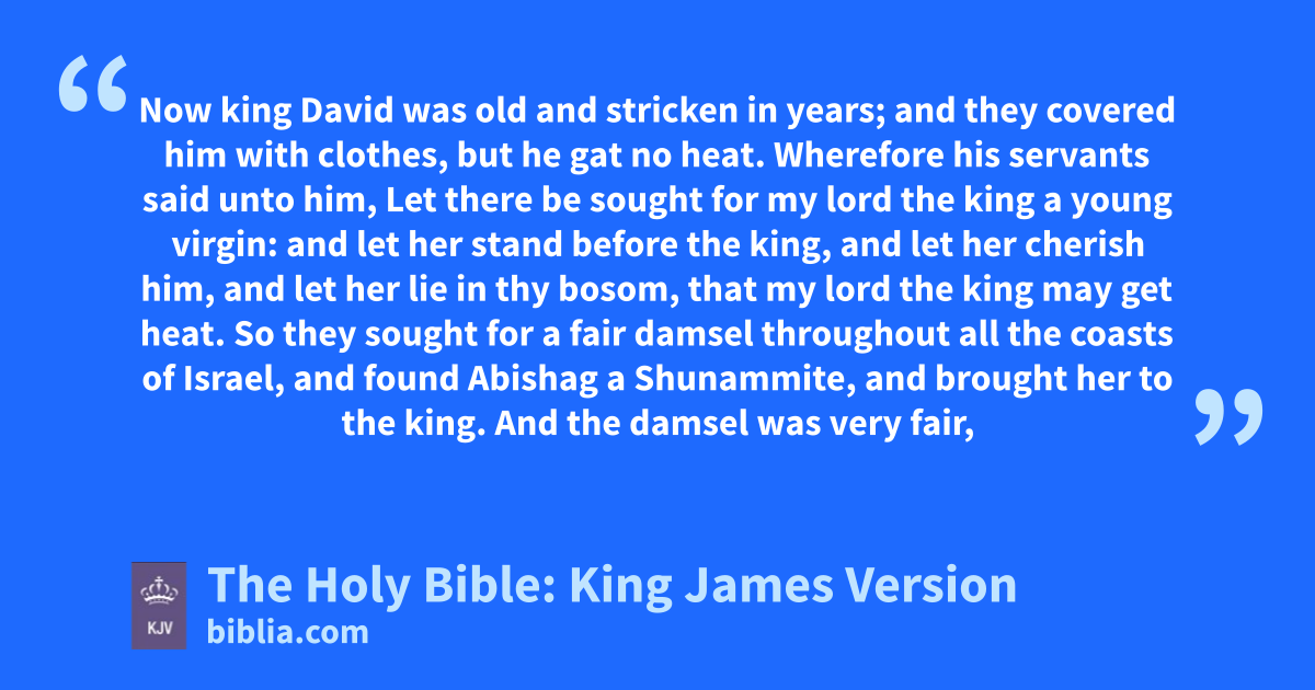 1 Now king David was old and strickena in years; and they covered him with clothes, but he gat no heat. 2 Wherefore his servants said unto him, Let there be sought for my lord the king a young virgin: and let her stand before the king, and let her cherish him, and let her lie in thy bosom, that my lord the king may get heat. 3 So they sought for a fair damsel throughout all the coasts of Israel, and found Abishag a Shunammite, and brought her to the king. 4 And the damsel was very fair, and cherished the king, and ministered to him: but the king knew her not.