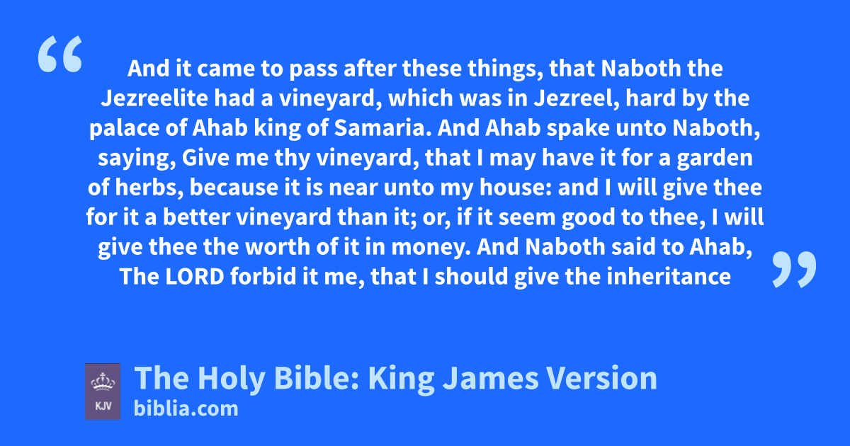 1 And it came to pass after these things, that Naboth the Jezreelite had a vineyard, which was in Jezreel, hard by the palace of Ahab king of Samaria. 2 And Ahab spake unto Naboth, saying, Give me thy vineyard, that I may have it for a garden of herbs, because it is near unto my house: and I will give thee for it a better vineyard than it; or, if it seem good to thee, I will give thee the worth of it in money. 3 And Naboth said to Ahab, The LORD forbid it me, that I should give the inheritance of my fathers unto thee. 4 And Ahab came into his house heavy and displeased because of the word which Naboth the Jezreelite had spoken to him: for he had said, I will not give thee the inheritance of my fathers. And he laid him down upon his bed, and turned away his face, and would eat no bread.