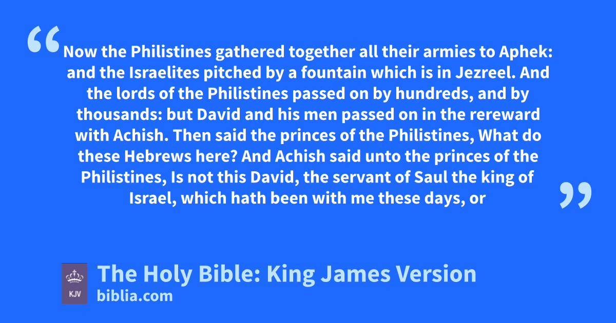 1 Now the Philistines gathered together all their armies to Aphek: and the Israelites pitched by a fountain which is in Jezreel. 2 And the lords of the Philistines passed on by hundreds, and by thousands: but David and his men passed on in the rereward with Achish. 3 Then said the princes of the Philistines, What do these Hebrews here? And Achish said unto the princes of the Philistines, Is not this David, the servant of Saul the king of Israel, which hath been with me these days, or these years, and I have found no fault in him since he fell unto me unto this day? 4 And the princes of the Philistines were wroth with him; and the princes of the Philistines said unto him, Make this fellow return, that he may go again to his place which thou hast appointed him, and let him not go down with us to battle, lest in the battle he be an adversary to us: for wherewith should he reconcile himself unto his master? should it not be with the heads of these men? 5 Is not this David, of whom they sang one to another in dances, saying, Saul slew his thousands, and David his ten thousands?