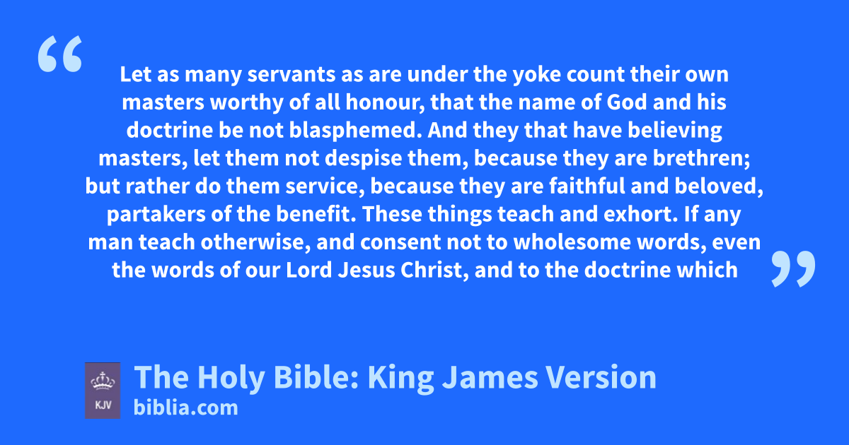 1 Let as many servants as are under the yoke count their own masters worthy of all honour, that the name of God and his doctrine be not blasphemed. 2 And they that have believing masters, let them not despise them, because they are brethren; but rather do them service, because they are faithfula and beloved, partakers of the benefit. These things teach and exhort. 3 If any man teach otherwise, and consent not to wholesome words, even the words of our Lord Jesus Christ, and to the doctrine which is according to godliness; 4 He is proudb, knowing nothing, but doting about questions and strifes of words, whereof cometh envy, strife, railings, evil surmisings, 5 Perverse disputings of men of corrupt minds, and destitute of the truth, supposing that gain is godliness: from such withdraw thyself.