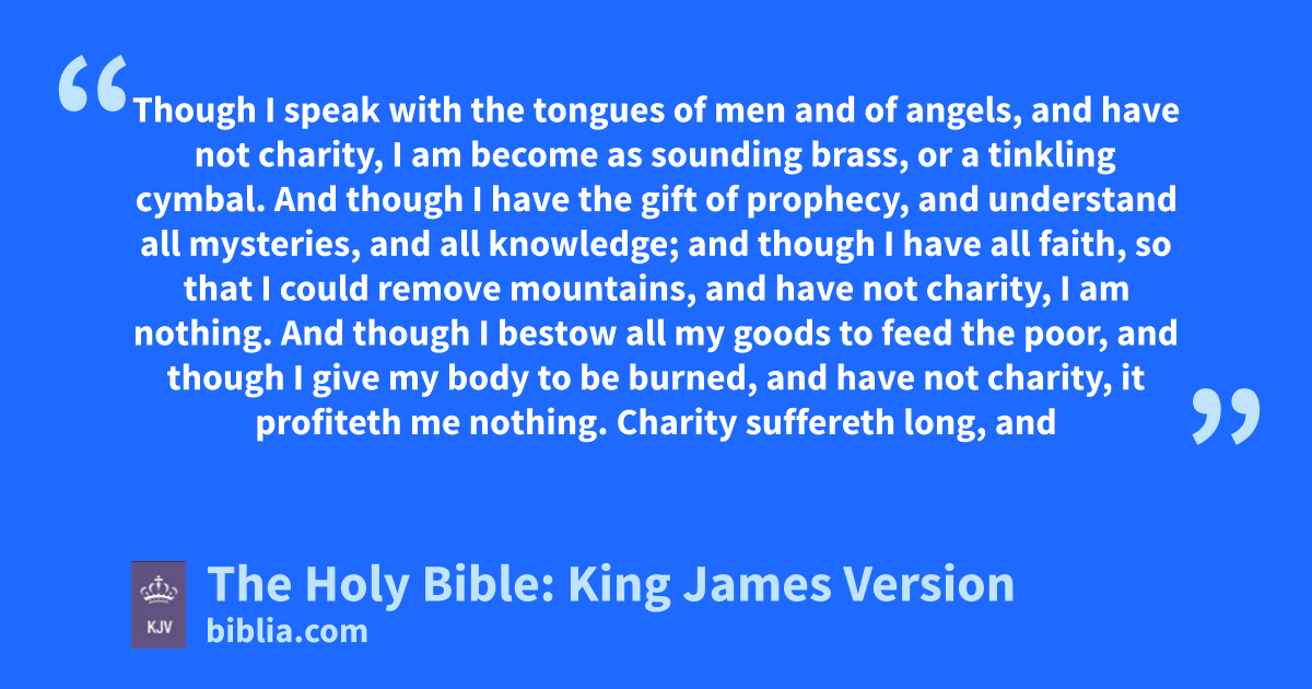 1 Though I speak with the tongues of men and of angels, and have not charity, I am become as sounding brass, or a tinkling cymbal. 2 And though I have the gift of prophecy, and understand all mysteries, and all knowledge; and though I have all faith, so that I could remove mountains, and have not charity, I am nothing. 3 And though I bestow all my goods to feed the poor, and though I give my body to be burned, and have not charity, it profiteth me nothing.