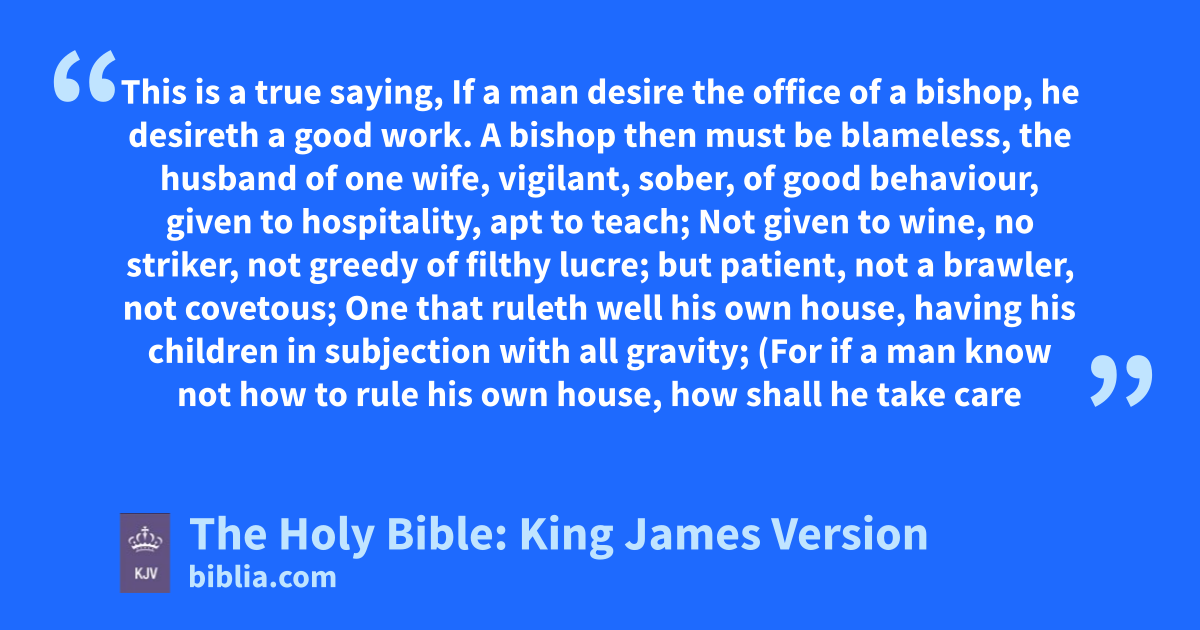 1 This is a true saying, If a man desire the office of a bishop, he desireth a good work. 2 A bishop then must be blameless, the husband of one wife, vigilant, sober, of good behaviour, given to hospitality, apt to teach; 3 Not given to wine, no striker, not greedy of filthy lucre; but patient, not a brawler, not covetous; 4 One that ruleth well his own house, having his children in subjection with all gravity; 5 (For if a man know not how to rule his own house, how shall he take care of the church of God?) 6 Not a novicea, lest being lifted up with pride he fall into the condemnation of the devil. 7 Moreover he must have a good report of them which are without; lest he fall into reproach and the snare of the devil.