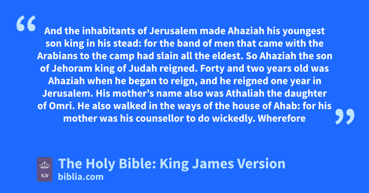 1 And the inhabitants of Jerusalem made Ahaziah his youngest son king in his stead: for the band of men that came with the Arabians to the camp had slain all the eldest. So Ahaziah the son of Jehoram king of Judah reigned. 2 Forty and two years old was Ahaziah when he began to reign, and he reigned one year in Jerusalem. His mother’s name also was Athaliah the daughter of Omri. 3 He also walked in the ways of the house of Ahab: for his mother was his counsellor to do wickedly. 4 Wherefore he did evil in the sight of the LORD like the house of Ahab: for they were his counsellors after the death of his father to his destruction. 5 He walked also after their counsel, and went with Jehoram the son of Ahab king of Israel to war against Hazael king of Syria at Ramothgilead: and the Syrians smote Joram. 6 And he returned to be healed in Jezreel because of the wounds which were given him at Ramah, when he fought with Hazael king of Syria. And Azariah the son of Jehoram king of Judah went down to see Jehoram the son of Ahab at Jezreel, because he was sick. 7 And the destructiona of Ahaziah was of God by coming to Joram: for when he was come, he went out with Jehoram against Jehu the son of Nimshi, whom the LORD had anointed to cut off the house of Ahab. 8 And it came to pass, that, when Jehu was executing judgment upon the house of Ahab, and found the princes of Judah, and the sons of the brethren of Ahaziah, that ministered to Ahaziah, he slew them. 9 And he sought Ahaziah: and they caught him, (for he was hid in Samaria,) and brought him to Jehu: and when they had slain him, they buried him: Because, said they, he is the son of Jehoshaphat, who sought the LORD with all his heart. So the house of Ahaziah had no power to keep still the kingdom.
