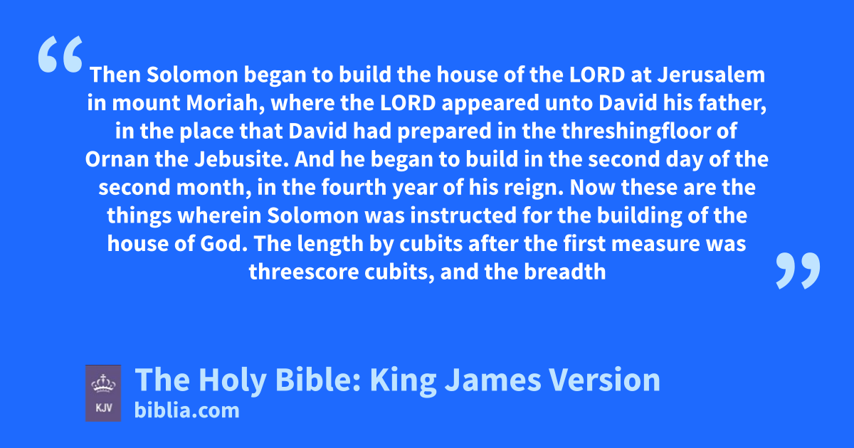 1 Then Solomon began to build the house of the LORD at Jerusalem in mount Moriah, where the LORD appeareda unto David his father, in the place that David had prepared in the threshingfloor of Ornan the Jebusite. 2 And he began to build in the second day of the second month, in the fourth year of his reign. 3 Now these are the things wherein Solomon was instructedb for the building of the house of God. The length by cubits after the first measure was threescore cubits, and the breadth twenty cubits. 4 And the porch that was in the front of the house, the length of it was according to the breadth of the house, twenty cubits, and the height was an hundred and twenty: and he overlaid it within with pure gold. 5 And the greater house he cieled with fir tree, which he overlaid with fine gold, and set thereon palm trees and chains. 6 And he garnishedc the house with precious stones for beauty: and the gold was gold of Parvaim. 7 He overlaid also the house, the beams, the posts, and the walls thereof, and the doors thereof, with gold; and graved cherubims on the walls. 8 And he made the most holy house, the length whereof was according to the breadth of the house, twenty cubits, and the breadth thereof twenty cubits: and he overlaid it with fine gold, amounting to six hundred talents. 9 And the weight of the nails was fifty shekels of gold. And he overlaid the upper chambers with gold.