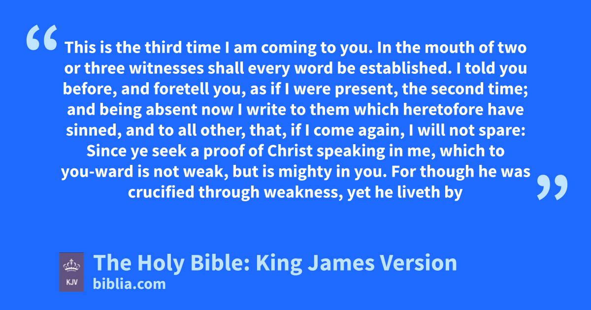 1 This is the third time I am coming to you. In the mouth of two or three witnesses shall every word be established. 2 I told you before, and foretell you, as if I were present, the second time; and being absent now I write to them which heretofore have sinned, and to all other, that, if I come again, I will not spare: 3 Since ye seek a proof of Christ speaking in me, which to you-ward is not weak, but is mighty in you. 4 For though he was crucified through weakness, yet he liveth by the power of God. For we also are weak in hima, but we shall live with him by the power of God toward you. 5 Examine yourselves, whether ye be in the faith; prove your own selves. Know ye not your own selves, how that Jesus Christ is in you, except ye be reprobates? 6 But I trust that ye shall know that we are not reprobates.