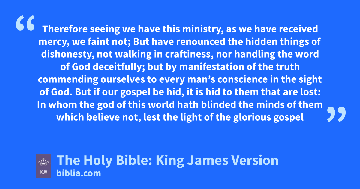 1 Therefore seeing we have this ministry, as we have received mercy, we faint not; 2 But have renounced the hidden things of dishonestya, not walking in craftiness, nor handling the word of God deceitfully; but by manifestation of the truth commending ourselves to every man’s conscience in the sight of God. 3 But if our gospel be hid, it is hid to them that are lost: 4 In whom the god of this world hath blinded the minds of them which believe not, lest the light of the glorious gospel of Christ, who is the image of God, should shine unto them. 5 For we preach not ourselves, but Christ Jesus the Lord; and ourselves your servants for Jesus’ sake. 6 For God, who commanded the light to shine out of darkness, hath shined in our hearts, to give the light of the knowledge of the glory of God in the face of Jesus Christ. 7 But we have this treasure in earthen vessels, that the excellency of the power may be of God, and not of us.