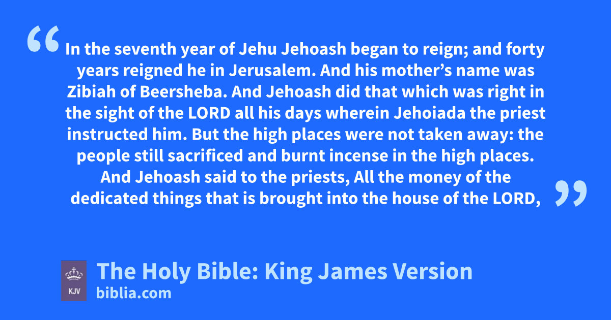 1 In the seventh year of Jehu Jehoash began to reign; and forty years reigned he in Jerusalem. And his mother’s name was Zibiah of Beersheba. 2 And Jehoash did that which was right in the sight of the LORD all his days wherein Jehoiada the priest instructed him. 3 But the high places were not taken away: the people still sacrificed and burnt incense in the high places.
