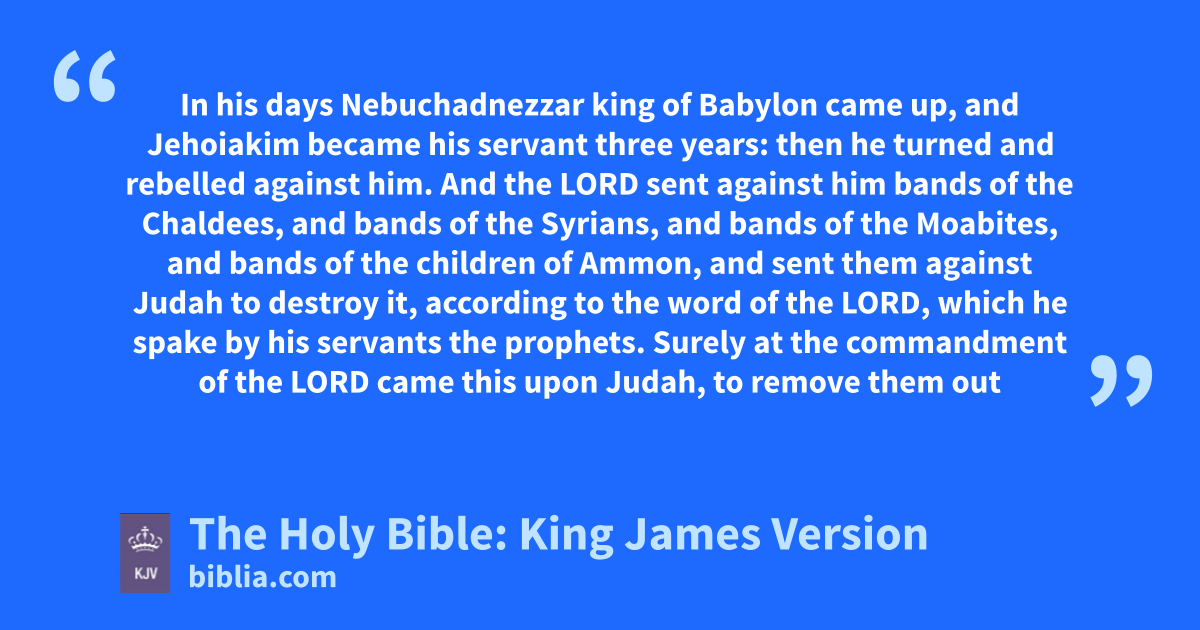 1 In his days Nebuchadnezzar king of Babylon came up, and Jehoiakim became his servant three years: then he turned and rebelled against him. 2 And the LORD sent against him bands of the Chaldees, and bands of the Syrians, and bands of the Moabites, and bands of the children of Ammon, and sent them against Judah to destroy it, according to the word of the LORD, which he spake bya his servants the prophets. 3 Surely at the commandment of the LORD came this upon Judah, to remove them out of his sight, for the sins of Manasseh, according to all that he did; 4 And also for the innocent blood that he shed: for he filled Jerusalem with innocent blood; which the LORD would not pardon. 5 Now the rest of the acts of Jehoiakim, and all that he did, are they not written in the book of the chronicles of the kings of Judah? 6 So Jehoiakim slept with his fathers: and Jehoiachin his son reigned in his stead. 7 And the king of Egypt came not again any more out of his land: for the king of Babylon had taken from the river of Egypt unto the river Euphrates all that pertained to the king of Egypt.