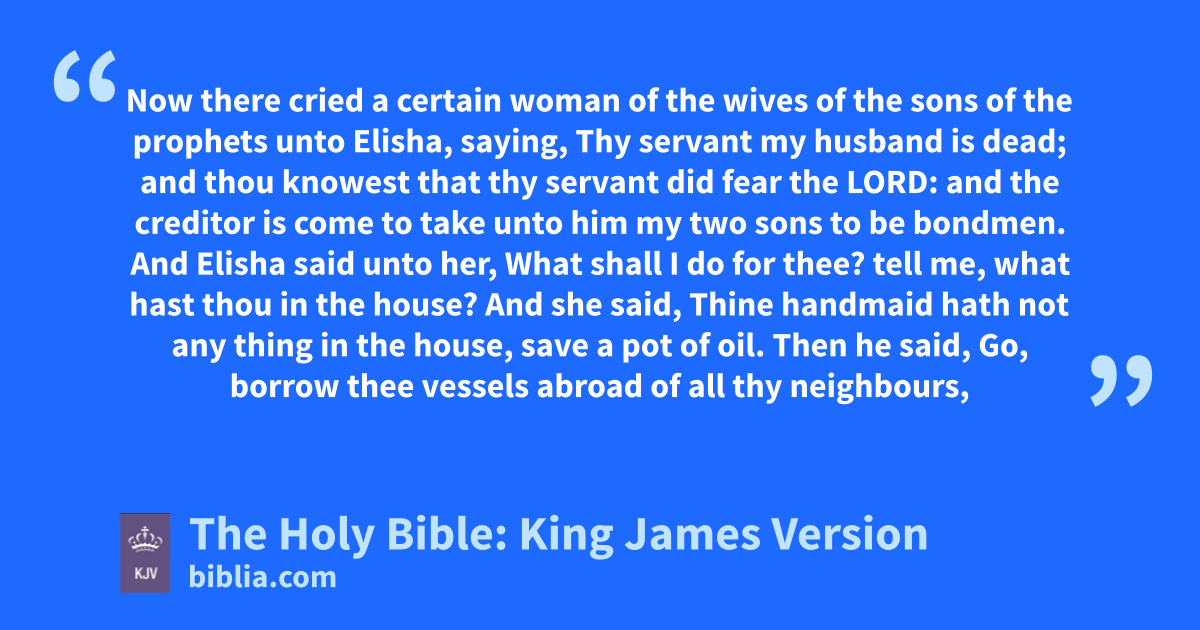 1 Now there cried a certain woman of the wives of the sons of the prophets unto Elisha, saying, Thy servant my husband is dead; and thou knowest that thy servant did fear the LORD: and the creditor is come to take unto him my two sons to be bondmen. 2 And Elisha said unto her, What shall I do for thee? tell me, what hast thou in the house? And she said, Thine handmaid hath not any thing in the house, save a pot of oil. 3 Then he said, Go, borrow thee vessels abroad of all thy neighbours, even empty vessels; borrow not a few. 4 And when thou art come in, thou shalt shut the door upon thee and upon thy sons, and shalt pour out into all those vessels, and thou shalt set aside that which is full. 5 So she went from him, and shut the door upon her and upon her sons, who brought the vessels to her; and she poured out. 6 And it came to pass, when the vessels were full, that she said unto her son, Bring me yet a vessel. And he said unto her, There is not a vessel more. And the oil stayed. 7 Then she came and told the man of God. And he said, Go, sell the oil, and pay thy debta, and live thou and thy children of the rest.