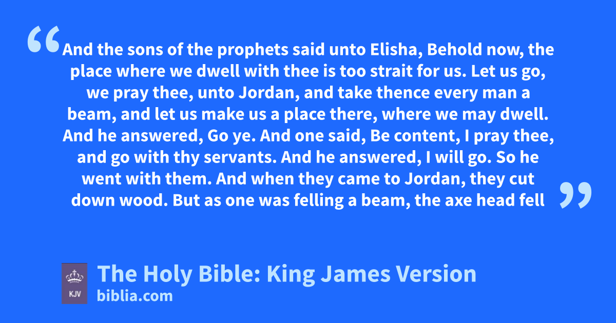 1 And the sons of the prophets said unto Elisha, Behold now, the place where we dwell with thee is too strait for us. 2 Let us go, we pray thee, unto Jordan, and take thence every man a beam, and let us make us a place there, where we may dwell. And he answered, Go ye. 3 And one said, Be content, I pray thee, and go with thy servants. And he answered, I will go. 4 So he went with them. And when they came to Jordan, they cut down wood. 5 But as one was felling a beam, the axe heada fell into the water: and he cried, and said, Alas, master! for it was borrowed. 6 And the man of God said, Where fell it? And he shewed him the place. And he cut down a stick, and cast it in thither; and the iron did swim. 7 Therefore said he, Take it up to thee. And he put out his hand, and took it.