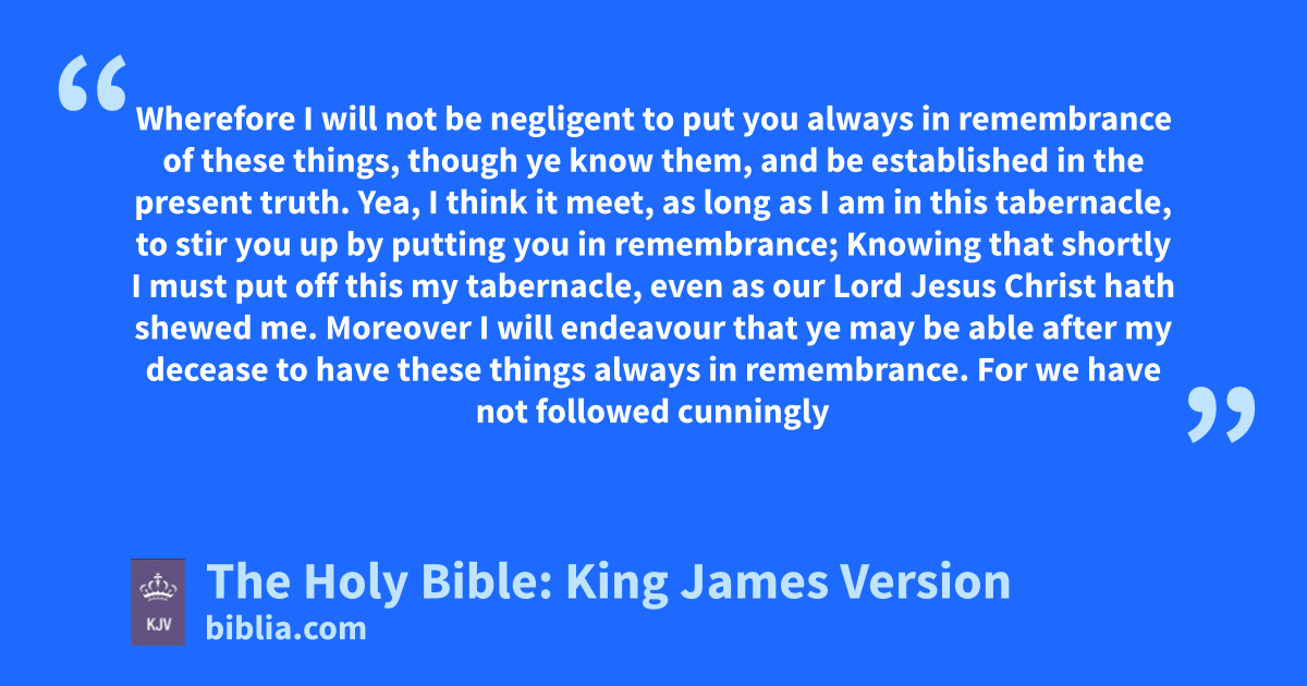 12 Wherefore I will not be negligent to put you always in remembrance of these things, though ye know them, and be established in the present truth. 13 Yea, I think it meet, as long as I am in this tabernacle, to stir you up by putting you in remembrance; 14 Knowing that shortly I must put off this my tabernacle, even as our Lord Jesus Christ hath shewed me. 15 Moreover I will endeavour that ye may be able after my decease to have these things always in remembrance.
