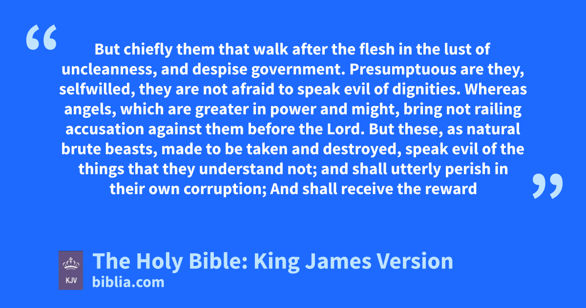 10 But chiefly them that walk after the flesh in the lust of uncleanness, and despise governmentb. Presumptuous are they, selfwilled, they are not afraid to speak evil of dignities. 11 Whereas angels, which are greater in power and might, bring not railing accusation against themc before the Lord. 12 But these, as natural brute beasts, made to be taken and destroyed, speak evil of the things that they understand not; and shall utterly perish in their own corruption; 13 And shall receive the reward of unrighteousness, as they that count it pleasure to riot in the day time. Spots they are and blemishes, sporting themselves with their own deceivings while they feast with you; 14 Having eyes full of adulteryd, and that cannot cease from sin; beguiling unstable souls: an heart they have exercised with covetous practices; cursed children: 15 Which have forsaken the right way, and are gone astray, following the way of Balaam the son of Bosor, who loved the wages of unrighteousness; 16 But was rebuked for his iniquity: the dumb ass speaking with man’s voice forbad the madness of the prophet. 17 These are wells without water, clouds that are carried with a tempest; to whom the mist of darkness is reserved for ever. 18 For when they speak great swelling words of vanity, they allure through the lusts of the flesh, through much wantonness, those that were cleane escaped from them who live in error. 19 While they promise them liberty, they themselves are the servants of corruption: for of whom a man is overcome, of the same is he brought in bondage. 20 For if after they have escaped the pollutions of the world through the knowledge of the Lord and Saviour Jesus Christ, they are again entangled therein, and overcome, the latter end is worse with them than the beginning. 21 For it had been better for them not to have known the way of righteousness, than, after they have known it, to turn from the holy commandment delivered unto them. 22 But it is happened unto them according to the true proverb, The dog is turned to his own vomit again; and the sow that was washed to her wallowing in the mire.