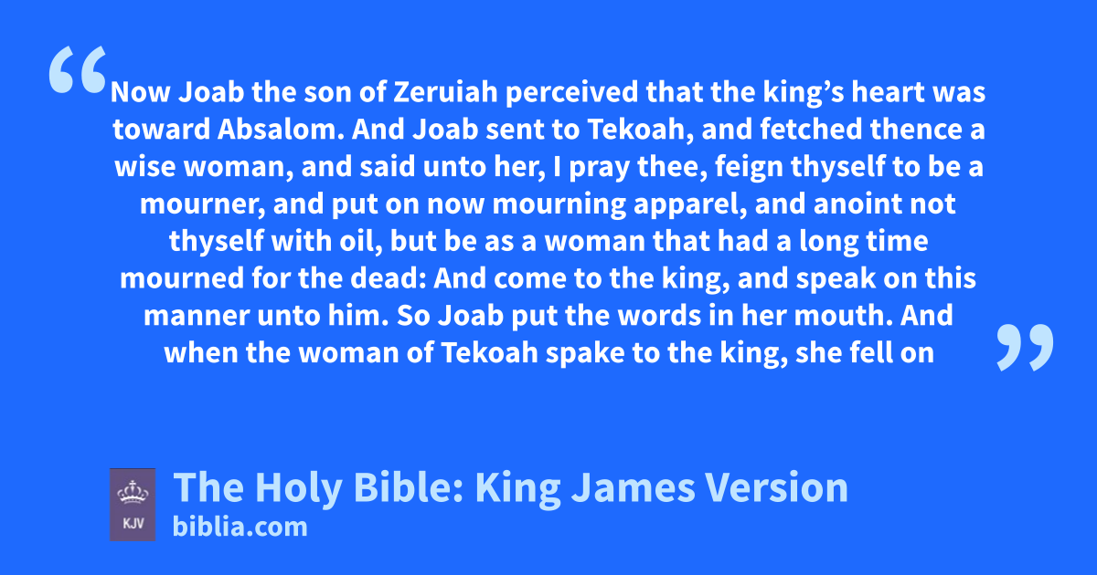 1 Now Joab the son of Zeruiah perceived that the king’s heart was toward Absalom. 2 And Joab sent to Tekoah, and fetched thence a wise woman, and said unto her, I pray thee, feign thyself to be a mourner, and put on now mourning apparel, and anoint not thyself with oil, but be as a woman that had a long time mourned for the dead: 3 And come to the king, and speak on this manner unto him. So Joab put the words in her mouth. 4 And when the woman of Tekoah spake to the king, she fell on her face to the ground, and did obeisance, and said, Helpa, O king. 5 And the king said unto her, What aileth thee? And she answered, I am indeed a widow woman, and mine husband is dead. 6 And thy handmaid had two sons, and they two strove together in the field, and there was none to part them, but the one smote the other, and slew him. 7 And, behold, the whole family is risen against thine handmaid, and they said, Deliver him that smote his brother, that we may kill him, for the life of his brother whom he slew; and we will destroy the heir also: and so they shall quench my coal which is left, and shall not leave to my husband neither name nor remainder uponb the earth. 8 And the king said unto the woman, Go to thine house, and I will give charge concerning thee. 9 And the woman of Tekoah said unto the king, My lord, O king, the iniquity be on me, and on my father’s house: and the king and his throne be guiltless. 10 And the king said, Whosoever saith ought unto thee, bring him to me, and he shall not touch thee any more. 11 Then said she, I pray thee, let the king remember the LORD thy God, that thou wouldest not suffer the revengers of blood to destroy any more, lest they destroy my son. And he said, As the LORD liveth, there shall not one hair of thy son fall to the earth. 12 Then the woman said, Let thine handmaid, I pray thee, speak one word unto my lord the king. And he said, Say on. 13 And the woman said, Wherefore then hast thou thought such a thing against the people of God? for the king doth speak this thing as one which is faulty, in that the king doth not fetch home again his banished. 14 For we must needs die, and are as water spilt on the ground, which cannot be gathered up again; neither doth God respect any person: yet doth he devise means, that his banished be not expelled from him. 15 Now therefore that I am come to speak of this thing unto my lord the king, it is because the people have made me afraid: and thy handmaid said, I will now speak unto the king; it may be that the king will perform the request of his handmaid. 16 For the king will hear, to deliver his handmaid out of the hand of the man that would destroy me and my son together out of the inheritance of God. 17 Then thine handmaid said, The word of my lord the king shall now be comfortablec: for as an angel of God, so is my lord the king to discern good and bad: therefore the LORD thy God will be with thee. 18 Then the king answered and said unto the woman, Hide not from me, I pray thee, the thing that I shall ask thee. And the woman said, Let my lord the king now speak. 19 And the king said, Is not the hand of Joab with thee in all this? And the woman answered and said, As thy soul liveth, my lord the king, none can turn to the right hand or to the left from ought that my lord the king hath spoken: for thy servant Joab, he bade me, and he put all these words in the mouth of thine handmaid: 20 To fetch about this form of speech hath thy servant Joab done this thing: and my lord is wise, according to the wisdom of an angel of God, to know all things that are in the earth.