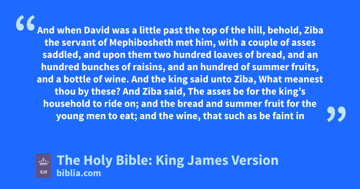 1 And when David was a little past the top of the hill, behold, Ziba the servant of Mephibosheth met him, with a couple of asses saddled, and upon them two hundred loaves of bread, and an hundred bunches of raisins, and an hundred of summer fruits, and a bottle of wine. 2 And the king said unto Ziba, What meanest thou by these? And Ziba said, The asses be for the king’s household to ride on; and the bread and summer fruit for the young men to eat; and the wine, that such as be faint in the wilderness may drink. 3 And the king said, And where is thy master’s son? And Ziba said unto the king, Behold, he abideth at Jerusalem: for he said, To day shall the house of Israel restore me the kingdom of my father. 4 Then said the king to Ziba, Behold, thine are all that pertained unto Mephibosheth. And Ziba said, I humblya beseech thee that I may find grace in thy sight, my lord, O king.