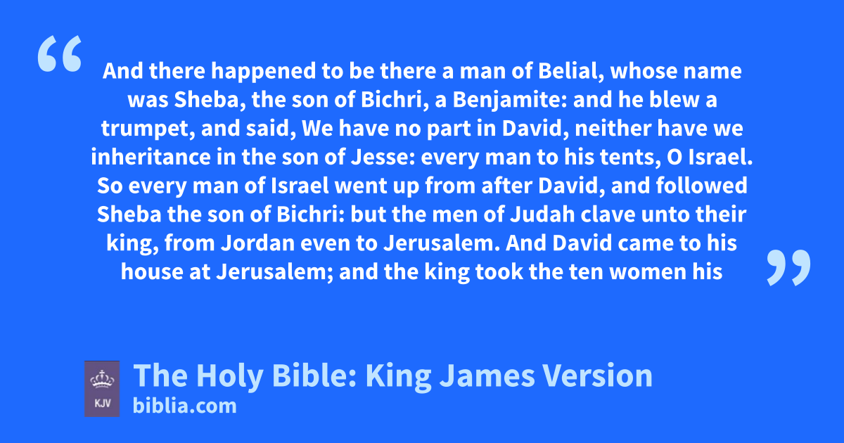 1 And there happened to be there a man of Belial, whose name was Sheba, the son of Bichri, a Benjamite: and he blew a trumpet, and said, We have no part in David, neither have we inheritance in the son of Jesse: every man to his tents, O Israel. 2 So every man of Israel went up from after David, and followed Sheba the son of Bichri: but the men of Judah clave unto their king, from Jordan even to Jerusalem. 3 And David came to his house at Jerusalem; and the king took the ten women his concubines, whom he had left to keep the house, and put them in warda, and fed them, but went not in unto them. So they were shut up unto the day of their death, living in widowhood.