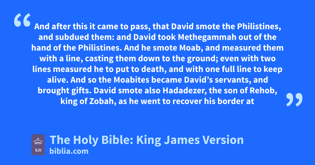 1 And after this it came to pass, that David smote the Philistines, and subdued them: and David took Methegammaha out of the hand of the Philistines. 2 And he smote Moab, and measured them with a line, casting them down to the ground; even with two lines measured he to put to death, and with one full line to keep alive. And so the Moabites became David’s servants, and brought gifts. 3 David smote also Hadadezerb, the son of Rehob, king of Zobah, as he went to recover his border at the river Euphrates. 4 And David took from him a thousand chariots, and seven hundred horsemen, and twenty thousand footmen: and David houghed all the chariot horses, but reserved of them for an hundred chariots. 5 And when the Syrians of Damascus came to succour Hadadezer king of Zobah, David slew of the Syrians two and twenty thousand men. 6 Then David put garrisons in Syria of Damascus: and the Syrians became servants to David, and brought gifts. And the LORD preserved David whithersoever he went. 7 And David took the shields of gold that were on the servants of Hadadezer, and brought them to Jerusalem. 8 And from Betah, and from Berothai, cities of Hadadezer, king David took exceeding much brass.