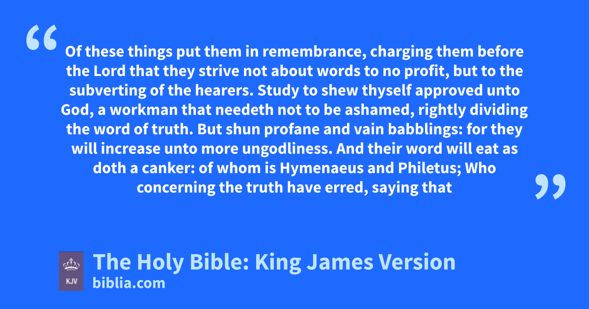 14 Of these things put them in remembrance, charging them before the Lord that they strive not about words to no profit, but to the subverting of the hearers. 15 Study to shew thyself approved unto God, a workman that needeth not to be ashamed, rightly dividing the word of truth. 16 But shun profane and vain babblings: for they will increase unto more ungodliness. 17 And their word will eat as doth a cankerb: of whom is Hymenaeus and Philetus; 18 Who concerning the truth have erred, saying that the resurrection is past already; and overthrow the faith of some.