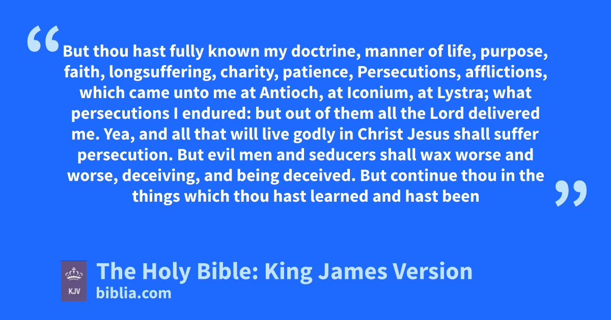 10 But thou hast fully known my doctrine, manner of life, purpose, faith, longsuffering, charity, patience, 11 Persecutions, afflictions, which came unto me at Antioch, at Iconium, at Lystra; what persecutions I endured: but out of them all the Lord delivered me. 12 Yea, and all that will live godly in Christ Jesus shall suffer persecution. 13 But evil men and seducers shall wax worse and worse, deceiving, and being deceived. 14 But continue thou in the things which thou hast learned and hast been assured of, knowing of whom thou hast learned them; 15 And that from a child thou hast known the holy scriptures, which are able to make thee wise unto salvation through faith which is in Christ Jesus. 16 All scripture is given by inspiration of God, and is profitable for doctrine, for reproof, for correction, for instruction in righteousness: 17 That the man of God may be perfect, throughly furnished unto all good works.