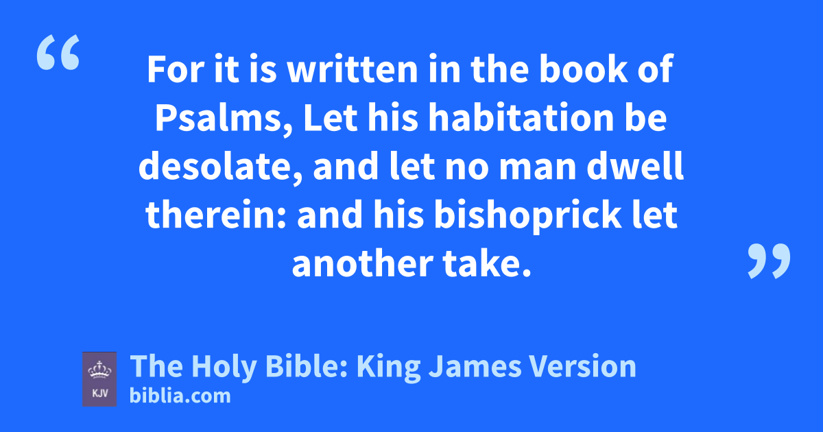 15 And in those days Peter stood up in the midst of the disciples, and said, (the number of names together were about an hundred and twenty,) 16 Men and brethren, this scripture must needs have been fulfilled, which the Holy Ghost by the mouth of David spake before concerning Judas, which was guide to them that took Jesus. 17 For he was numbered with us, and had obtained part of this ministry. 18 Now this man purchased a field with the reward of iniquity; and falling headlong, he burst asunder in the midst, and all his bowels gushed out. 19 And it was known unto all the dwellers at Jerusalem; insomuch as that field is called in their proper tongue, Aceldama, that is to say, The field of blood. 20 For it is written in the book of Psalms, Let his habitation be desolate, and let no man dwell therein: and his bishoprickb let another take. 21 Wherefore of these men which have companied with us all the time that the Lord Jesus went in and out among us, 22 Beginning from the baptism of John, unto that same day that he was taken up from us, must one be ordained to be a witness with us of his resurrection. 23 And they appointed two, Joseph called Barsabas, who was surnamed Justus, and Matthias. 24 And they prayed, and said, Thou, Lord, which knowest the hearts of all men, shew whether of these two thou hast chosen, 25 That he may take part of this ministry and apostleship, from which Judas by transgression fell, that he might go to his own place. 26 And they gave forth their lots; and the lot fell upon Matthias; and he was numbered with the eleven apostles.