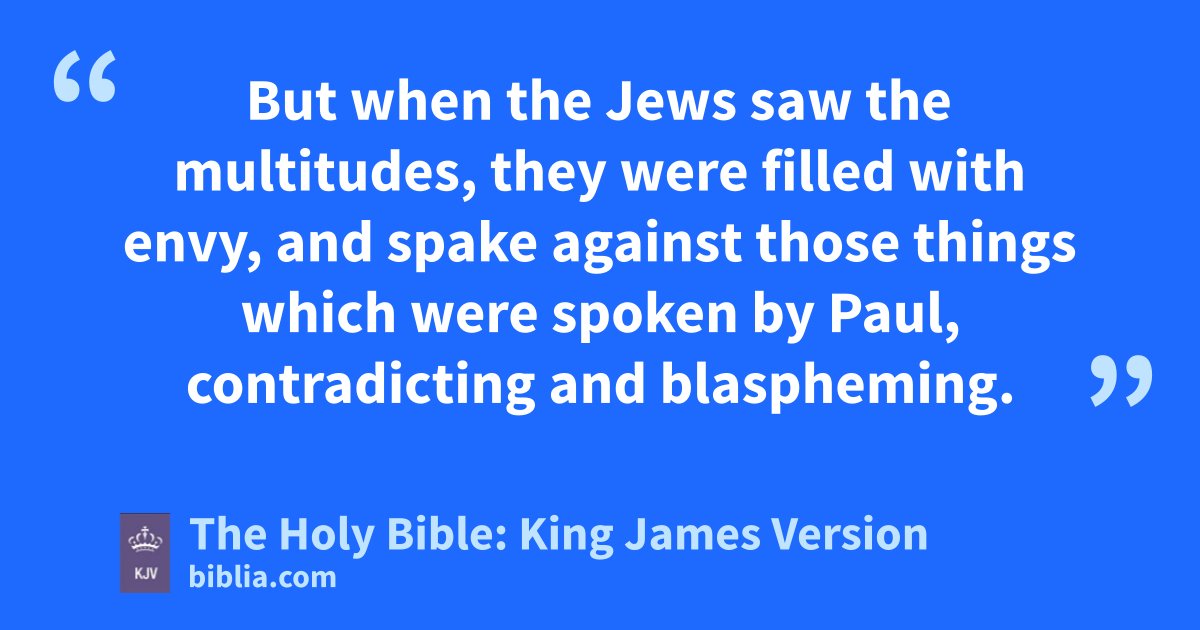 42 And when the Jews were gone out of the synagogue, the Gentiles besought that these words might be preached to them the nextb sabbath. 43 Now when the congregation was broken up, many of the Jews and religious proselytes followed Paul and Barnabas: who, speaking to them, persuaded them to continue in the grace of God. 44 And the next sabbath day came almost the whole city together to hear the word of God. 45 But when the Jews saw the multitudes, they were filled with envy, and spake against those things which were spoken by Paul, contradicting and blaspheming. 46 Then Paul and Barnabas waxed bold, and said, It was necessary that the word of God should first have been spoken to you: but seeing ye put it from you, and judge yourselves unworthy of everlasting life, lo, we turn to the Gentiles. 47 For so hath the Lord commanded us, saying, I have set thee to be a light of the Gentiles, that thou shouldest be for salvation unto the ends of the earth. 48 And when the Gentiles heard this, they were glad, and glorified the word of the Lord: and as many as were ordained to eternal life believed. 49 And the word of the Lord was published throughout all the region. 50 But the Jews stirred up the devout and honourable women, and the chief men of the city, and raised persecution against Paul and Barnabas, and expelled them out of their coasts. 51 But they shook off the dust of their feet against them, and came unto Iconium. 52 And the disciples were filled with joy, and with the Holy Ghost.