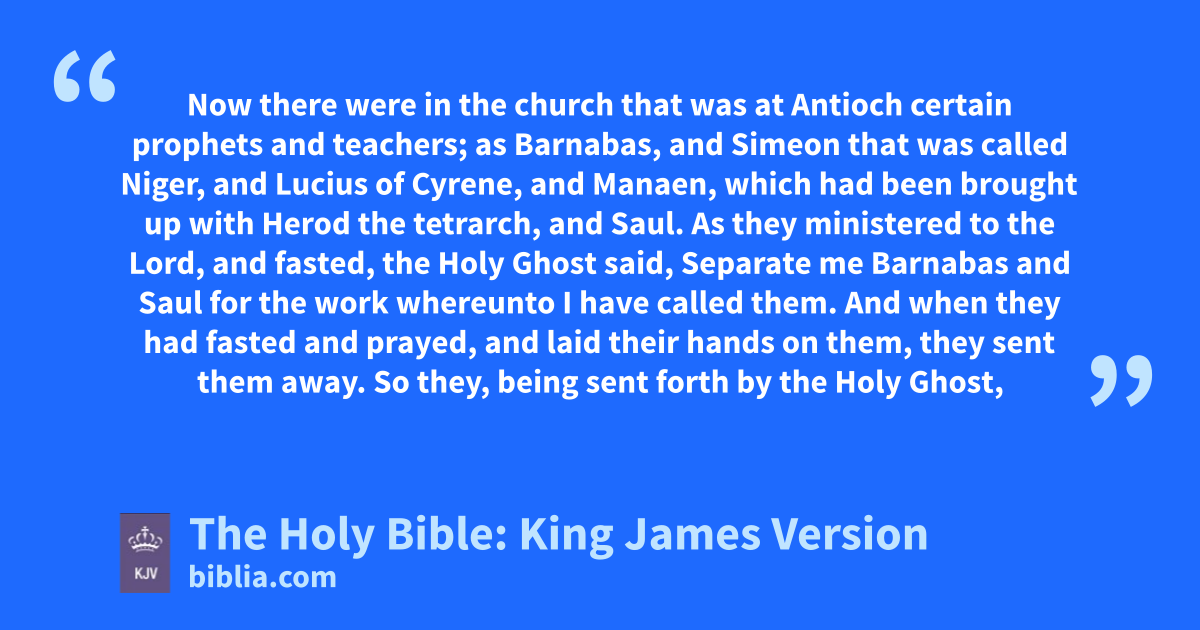 1 Now there were in the church that was at Antioch certain prophets and teachers; as Barnabas, and Simeon that was called Niger, and Lucius of Cyrene, and Manaen, which had been brought up with Herod the tetrarch, and Saul. 2 As they ministered to the Lord, and fasted, the Holy Ghost said, Separate me Barnabas and Saul for the work whereunto I have called them. 3 And when they had fasted and prayed, and laid their hands on them, they sent them away.